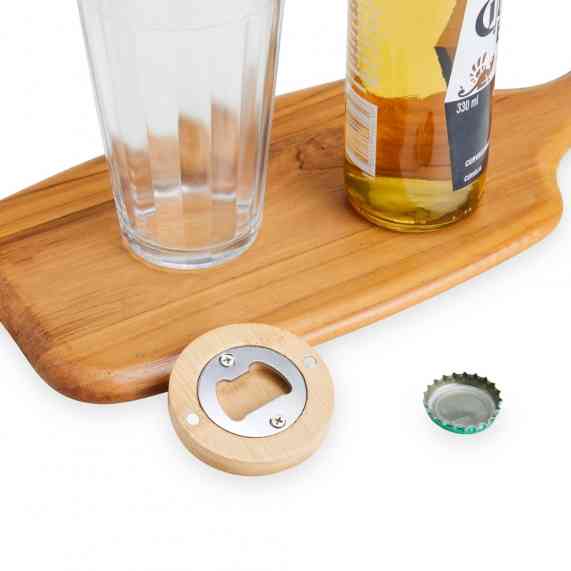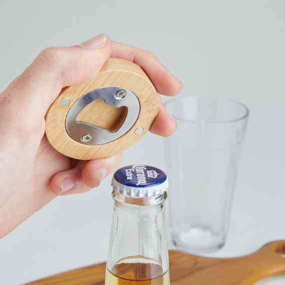 Abridor de garrafa em metal com acabamento em bambu e imã.