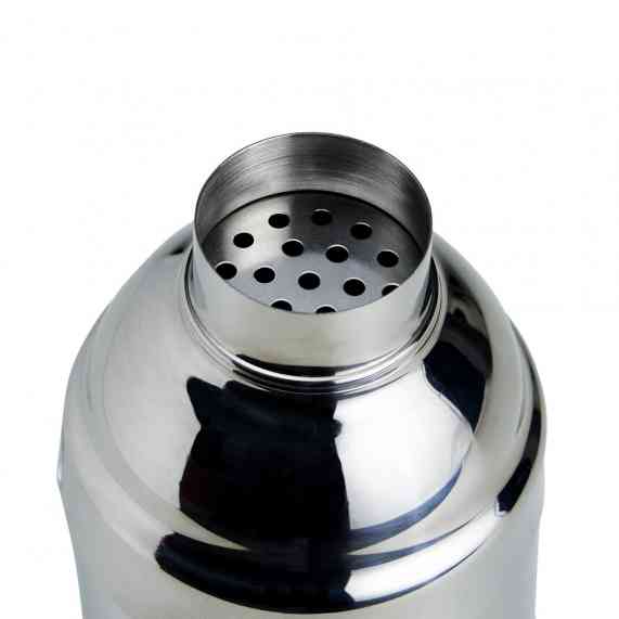 Coqueteleira de inox com capacidade para 750ml, contém tampa de pressão com peneira e tampa protetora.