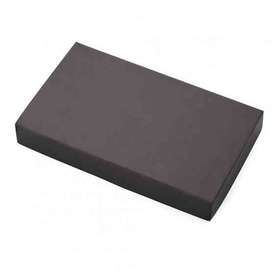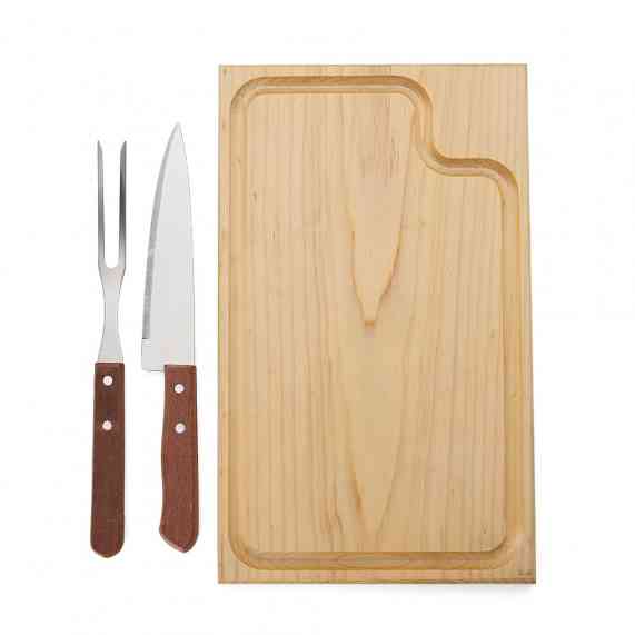 Kit churrasco três peças em estojo de papel kraft, contém: faca, garfo e tábua de corte com canaleta.