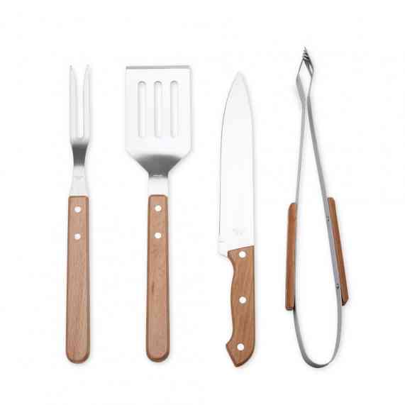 Prepare churrascos memoráveis e deliciosos com o nosso kit com quatro peças essenciais: espátula, garfo, pegador e faca de 7 polegadas, todas em aço inox com cabos de madeira, acomodadas em um estojo de nylon que facilita o armazenamento e transporte.