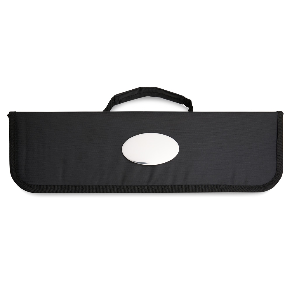 Praticidade para qualquer churrasco! Este kit conta com quatro peças essenciais: espátula, garfo, pegador e faca de 6 polegadas, todas em aço inox com cabos de madeira, acomodadas em um estojo de nylon que facilita o armazenamento e transporte.