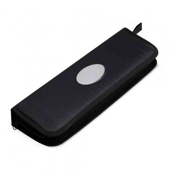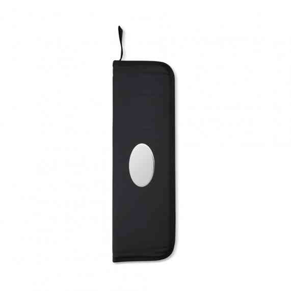 Kit churrasco 4 peças em estojo de nylon com alça. Possui: pegador, garfo, faca e espátula de madeira, proteções plásticas(faca e garfo) e parte interna com elástico para guardar as peças.