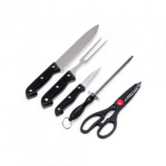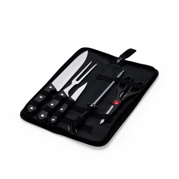 Churrascos irresistíveis começam com os utensílios certos! Nosso kit de 5 peças em inox, com cabos plásticos e estojo em nylon, inclui: uma faca chef de 7 polegadas, versátil para diversas tarefas na cozinha; uma faca de legumes de 3 polegadas, ideal para descascar e cortar vegetais; um garfo perfeito para dominar a grelha; uma chaira, essencial para manter as facas sempre afiadas; e uma tesoura multiuso para cortar alimentos, legumes, verduras e carnes. Além disso, a tesoura possui pequenos dentes entre os cabos que funcionam como um quebra-nozes. O kit também acompanha uma plaquinha de metal, permitindo personalizar e dar um toque único ao churrasco. Este kit é perfeito para preparar churrascos deliciosos!
