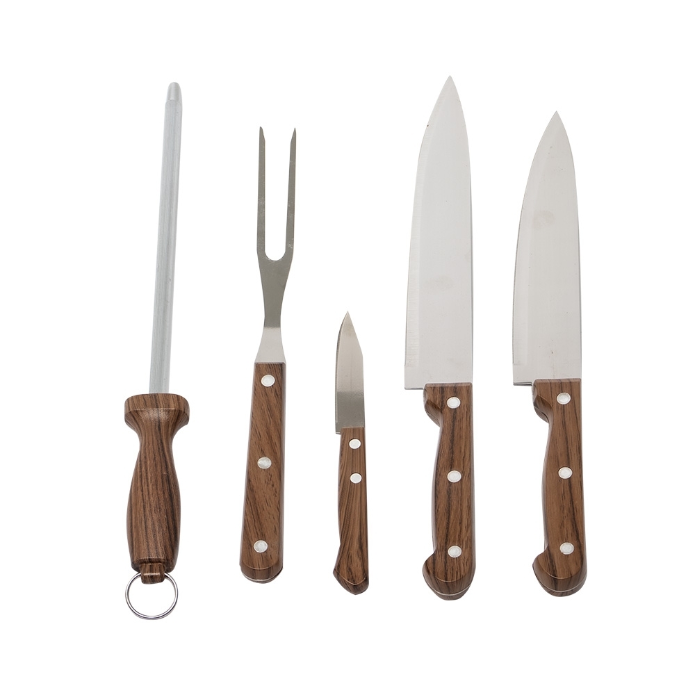 O kit perfeito para os verdadeiros amantes de churrasco! Composto por 5 peças em inox com cabos de madeira, nosso kit inclui três facas, sendo de 7”, 6” e 3” polegadas, além de um garfo e uma chaira, todos acomodados em um prático estojo de nylon, ideal para transportar facilmente para qualquer lugar.