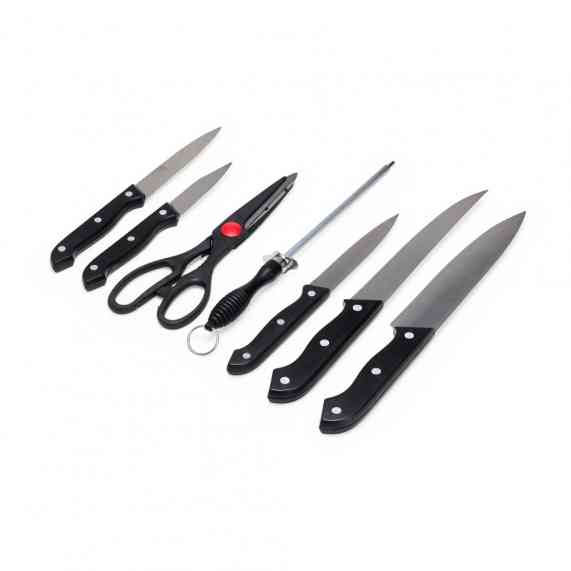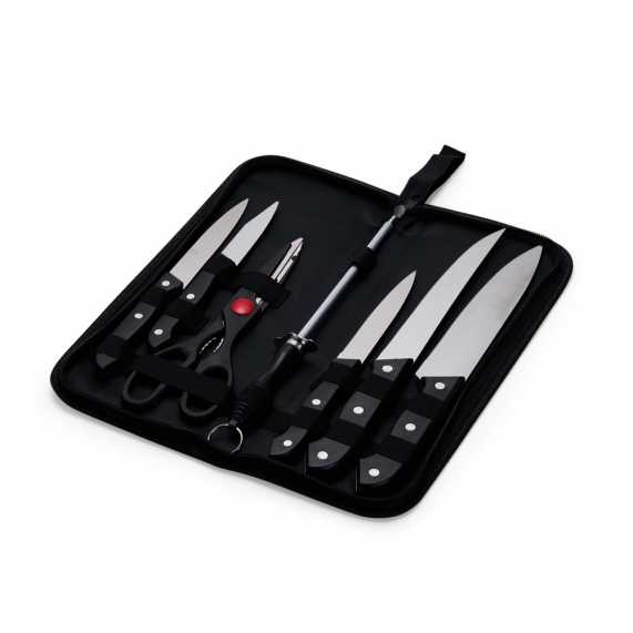 O churrasco vai ficar ainda melhor com o nosso kit de 7 peças em inox, incluso: uma faca de chef de 7 polegadas; uma faca de desossa de 7 polegadas; uma faca para fatiar de 4,5 polegadas, uma faca de descascar de 4,5 polegadas, uma faca de legumes de 3 polegadas; uma chaira, essencial para manter as facas sempre afiadas; e uma tesoura multiuso para cortar alimentos, legumes, verduras e carnes, todas as peças possuem cabo plástico. Além disso, a tesoura possui pequenos dentes entre os cabos que funcionam como um quebra-nozes. O kit também acompanha uma plaquinha de metal, permitindo a personalização para dar um toque único ao estojo e ainda mais estilo quando for preparar aquele churrasco de respeito.