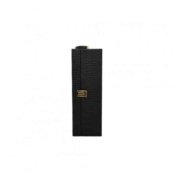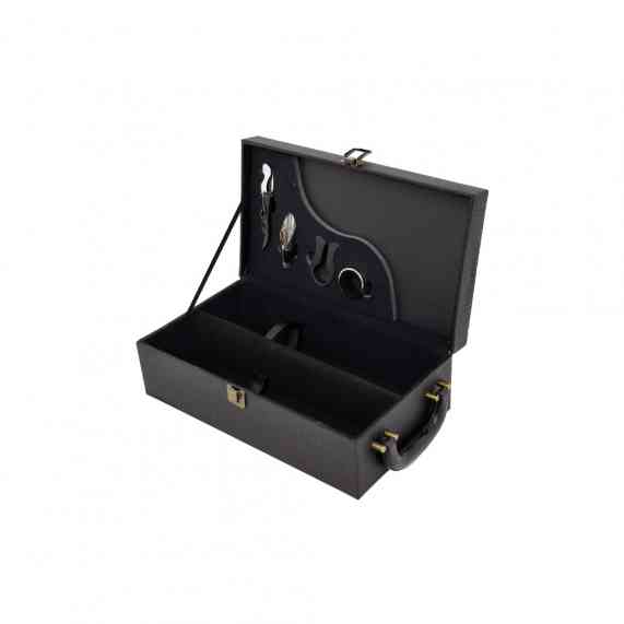 Kit vinho 4 peças em maleta de couro sintético texturizada. Contém saca-rolhas metálico, bico condutor com tampa, cortador de lacre e wine collar. Maleta com alça, trava de segurança e plaquinha plástica fixa com fita dupla face. Área interna revestida de veludo com suportes de nylon com velcro e duas repartições para garrafas.