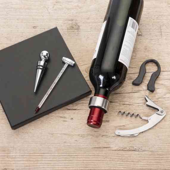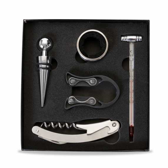 Kit vinho com 5 peças em estojo de papelão, revestido parte interna com espuma. Possui: tampa de bico, wine collar, termômetro, cortador de lacre e saca-rolha.