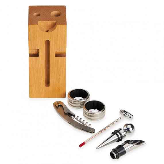 Kit vinho 6 peças em cepo de madeira, contém tampa de bico, bico condutor com tampa, termômetro, dois wine collars e saca rolhas metálico com abridor e lâmina de corte.