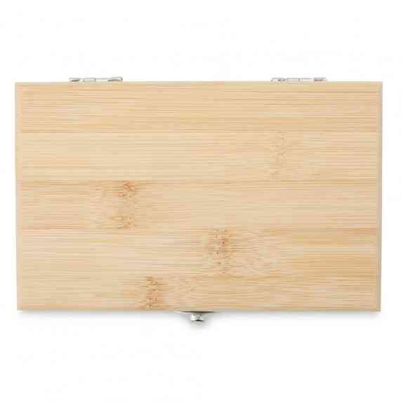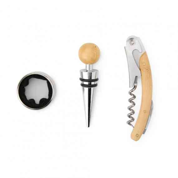 O kit vinho com 3 peças com estojo de bambu é a escolha perfeita para quem busca elegância e funcionalidade. Acompanha um saca-rolhas metálico com acabamento em bambu, que possui lâmina de corte e abridor de garrafa, uma tampa de bico com detalhe em bambu e silicone, e um wine collar. A caixa de bambu tem um design sofisticado e rústico, e contém ainda um berço de espuma interno, garantindo a proteção dos itens.