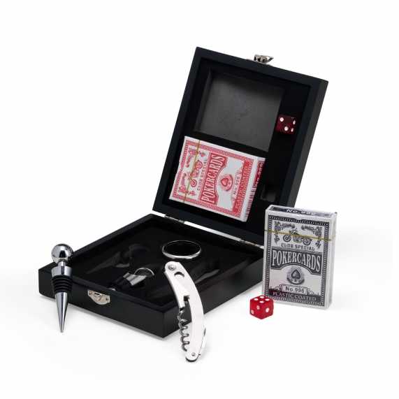 Se divirta enquanto degusta um bom vinho! Nosso kit vinho com 4 peças vem em um estojo feito em MDF com trava de segurança e área interna com berço de espuma. Contém wine collar, tampa de bico, bico condutor com tampa e saca-rolhas metálico com lâmina de corte e abridor de garrafa. Acompanham ainda 2 baralhos completos + 2 dados para uma noite completa de jogos. Azar é ainda não ter um kit desse!