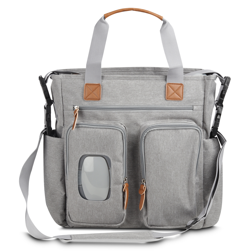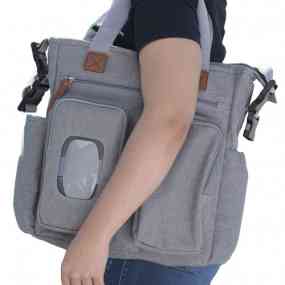Bolsa multifuncional em poliéster com detalhes em PU. Possui 2 compartimentos laterais, 3 bolsos frontais com zíper, 1 na parte oposta com fechamento em velcro, incluindo um específico para lenços umedecidos. Conta com alças de ombro e de mão com acabamento em PU, além de interior espaçoso com divisórias e fechamento em zíper. Prática e organizada para o dia a dia.