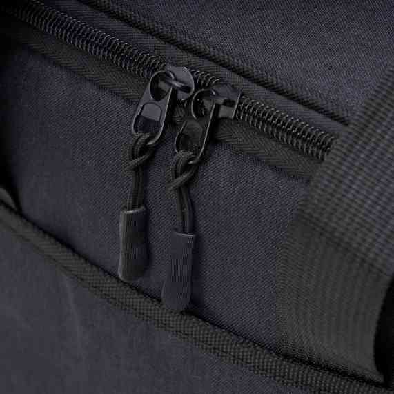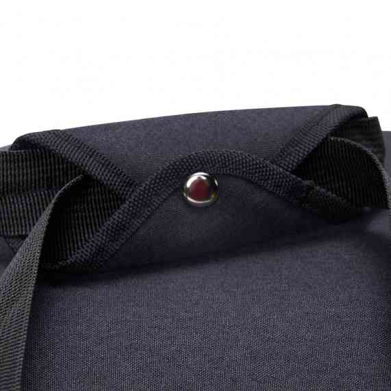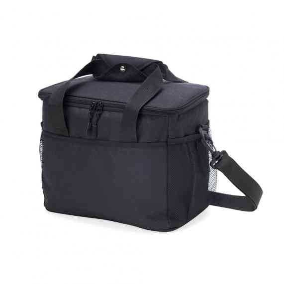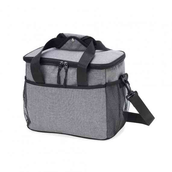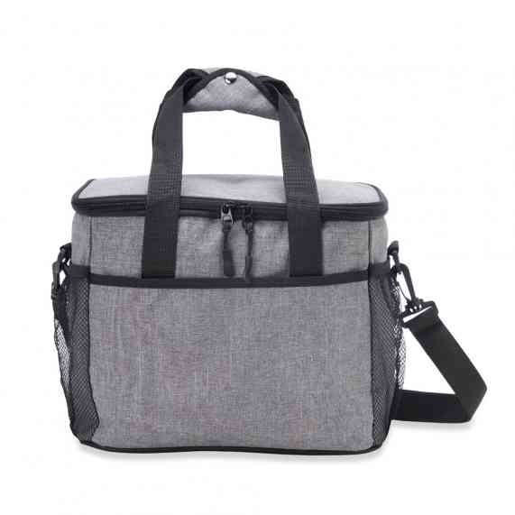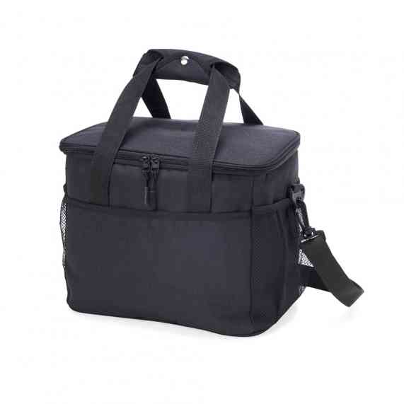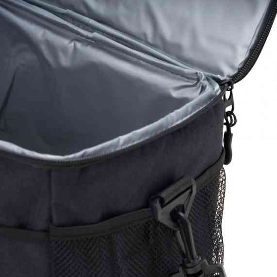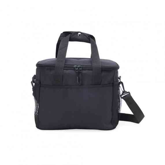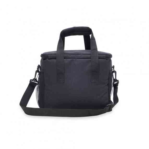 Bolsa térmica de nylon 14 litros com bolso frontal e bolsos laterais em malha. Compartimento principal com revestimento térmico soldado antivazamento e alças de mãos com suporte de juntura. Acompanha alça transversal.
