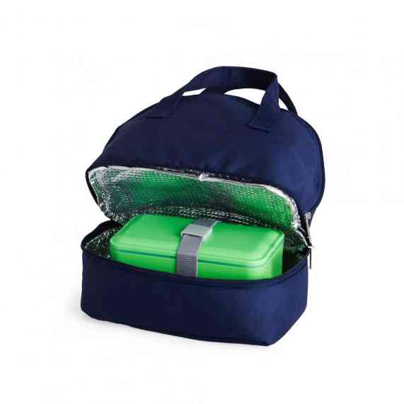 Bolsa térmica dupla em oxford com dois compartimentos térmicos isolados, capacidade de 6 litros. Contém alças de mãos.