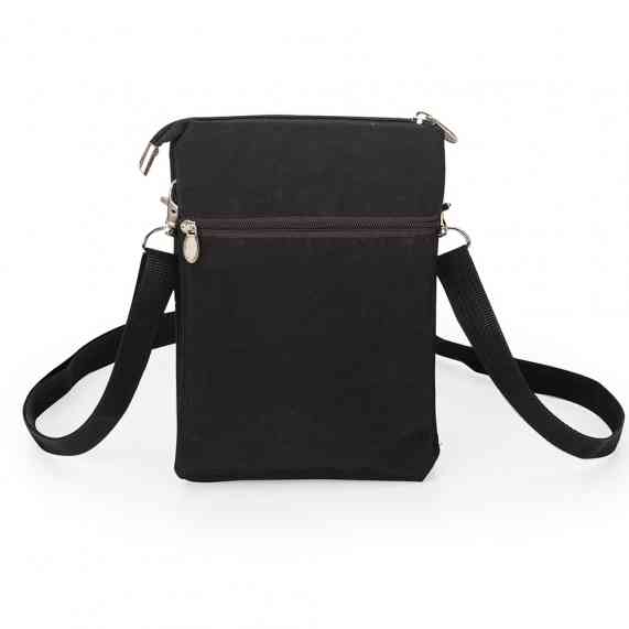 Bolsa de ombro em nylon resistente à água com três compartimentos e plaquinha personalizável em couro sintético.