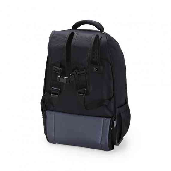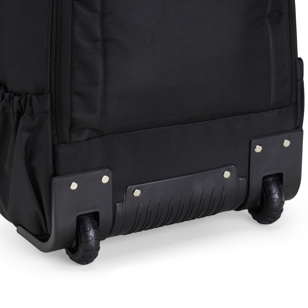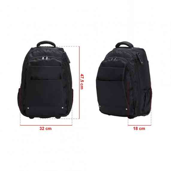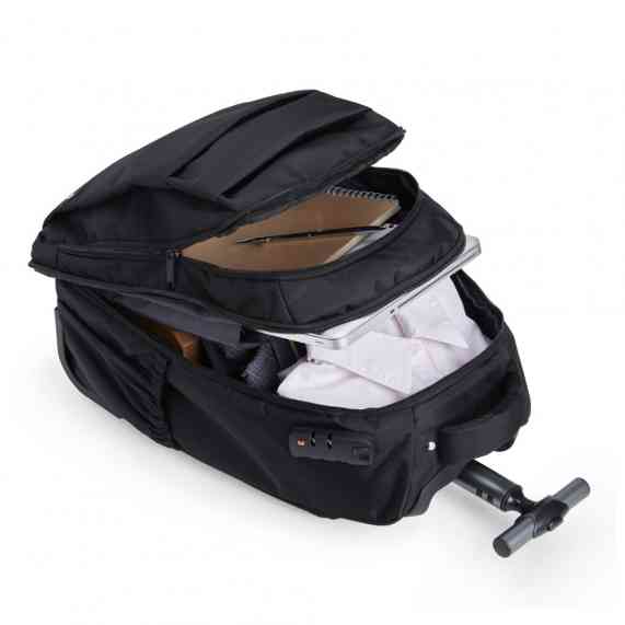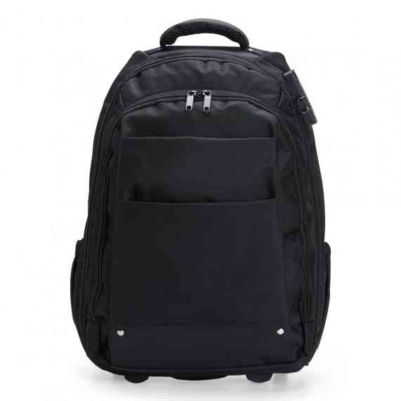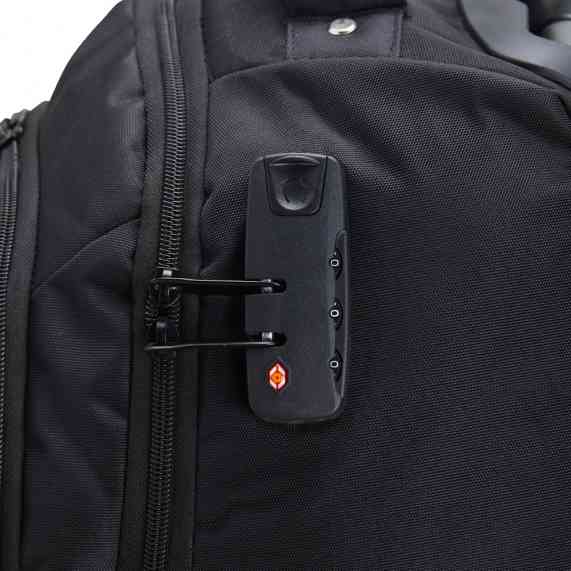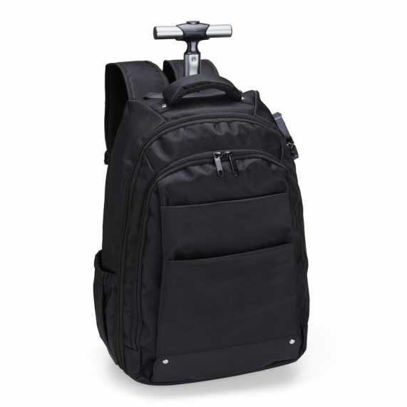 Mochila 27 litros com rodinhas e cadeado TSA. Possui padrão para bagagem de mão, conforme especificações ANAC (Agência Nacional de Aviação Civil) Confeccionada em nylon, contém alça revestida com espuma para um maior conforto, puxador retrátil com regulagem e botão acionador, alças para as costas escondidas no compartimento traseiro com zíper. Com 5 compartimentos, sendo um pequeno para carteira e canetas, dois medianos para documentos, bolsos nas laterais, bolso para notebook até 15,6 polegadas com divisórias para celular e forro com zíper. Possui duas rodinhas e freio em plástico, além de um sistema velcro para junção do compartimento das alças com a parte inferior, tampando as rodinhas enquanto transporta a mochila nas costas.