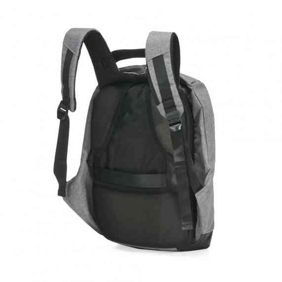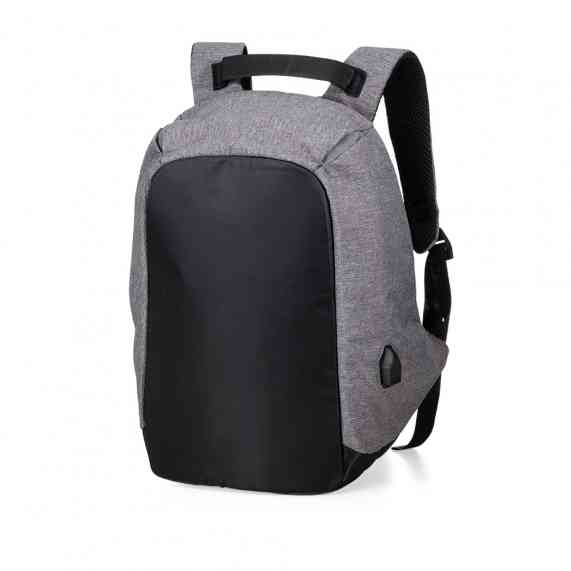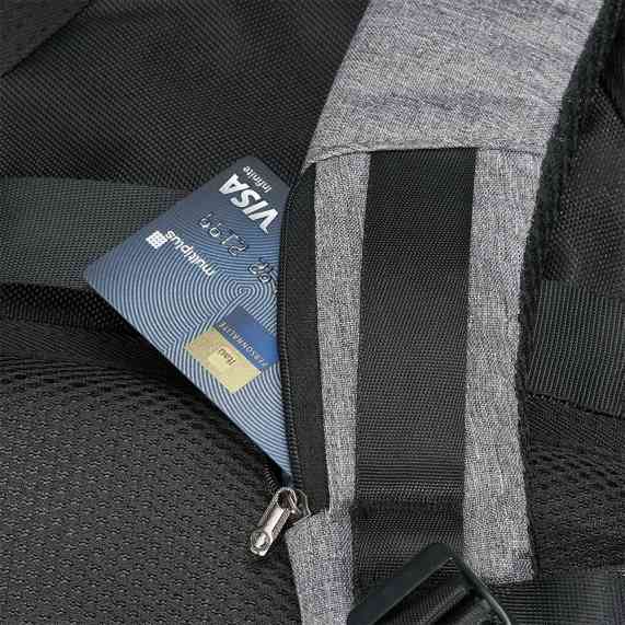 Mochila anatômica antifurto de 29 litros em poliéster resistente à água com dois compartimentos, sendo um deles exclusivo para cartões. Compartimento principal com amplo espaço e bolso para notebook 14, bolsos internos, suporte externo usb, alça para encaixe em malas de viagem e revestimento costado espumado.