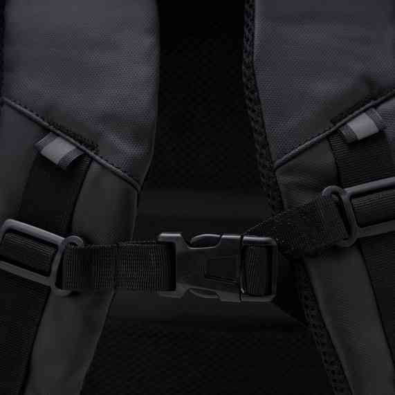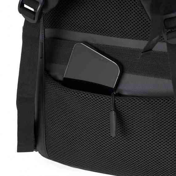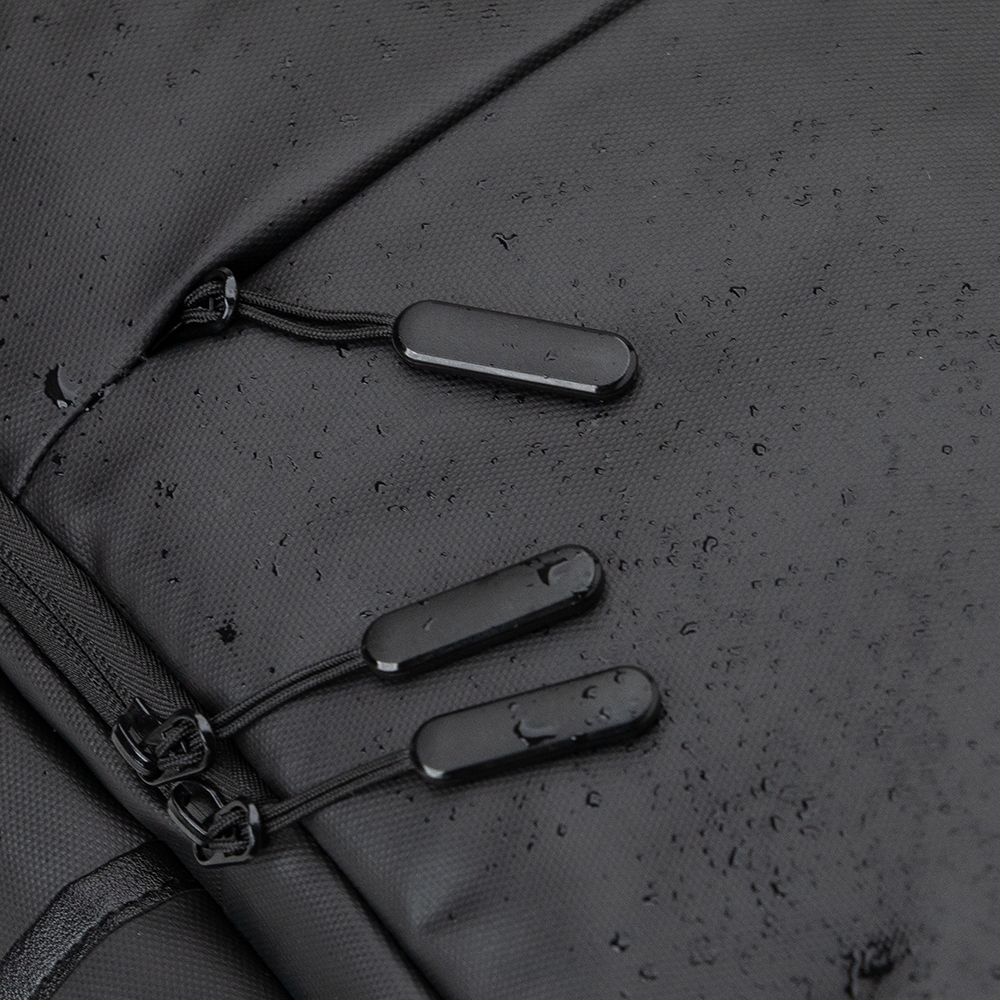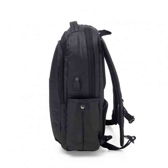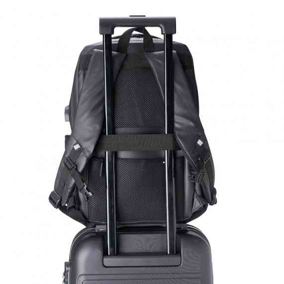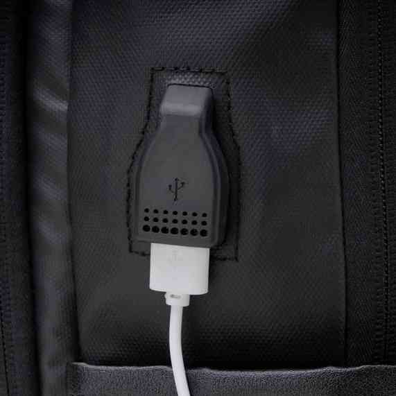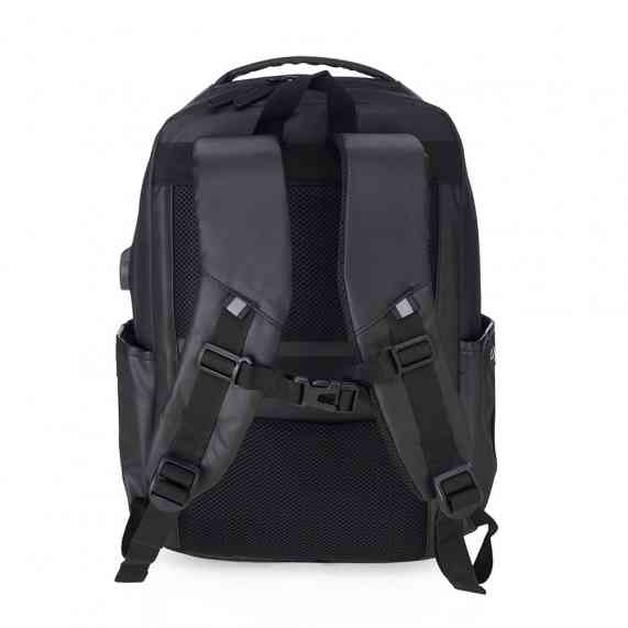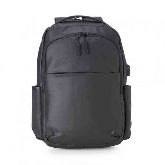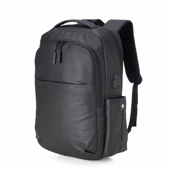 Mochila em couro sintético 20 litros resistente à água com quatro compartimentos, sendo o principal com bolso para notebook até 14 polegadas e um exclusivo com proteção contra furto. Com divisórias internas para acessórios, a mochila possui bolsos laterais, suporte externo USB, duas alças de mãos, alça para encaixe em malas de viagem e área costada com revestimento espumado.