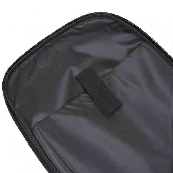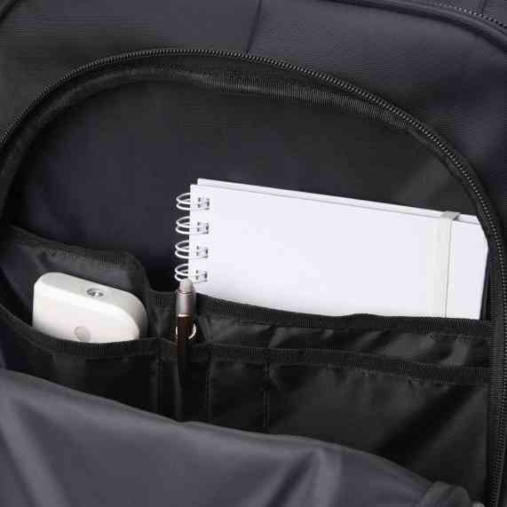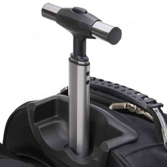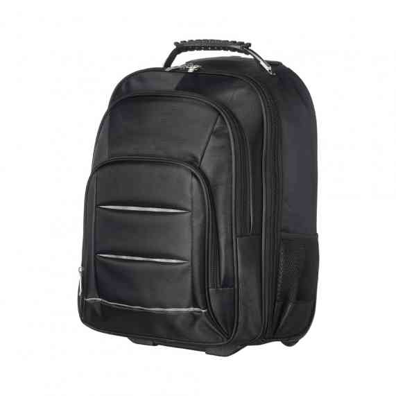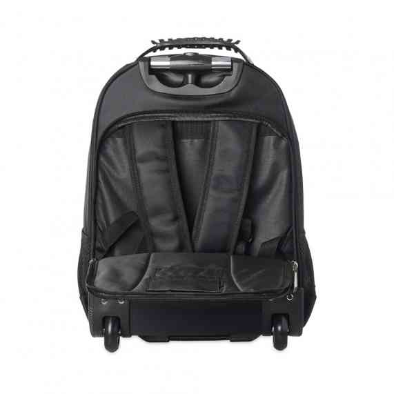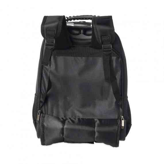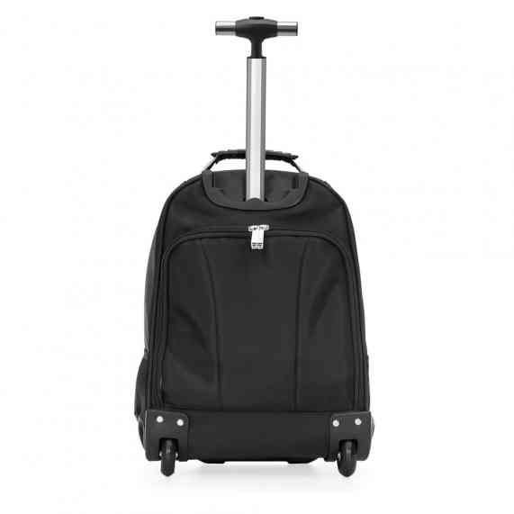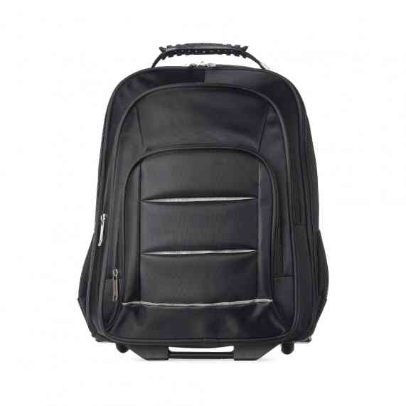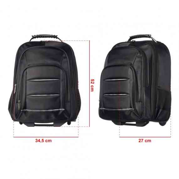 Mochila de carrinho 42 litros com padrão para bagagem de mão, conforme especificações IATA (Associação Internacional de Transportes Aéreos). Confeccionada em nylon, contém alça de mão com pegador emborrachado com cabo de aço interno para garantir maior resistência, puxador retrátil com regulagem e botão acionador, alças para as costas escondidas no compartimento traseiro com zíper, compartimento mediano com divisórias para documentos e canetas, compartimento frontal pequeno e bolsos laterais em malha. O compartimento principal possui bolso para notebook até 13.3 polegadas e forro com zíper. Possui duas rodinhas e freio em plástico, além de um sistema velcro para junção do compartimento das alças com a parte inferior, tampando as rodinhas enquanto transporta a mochila nas costas.