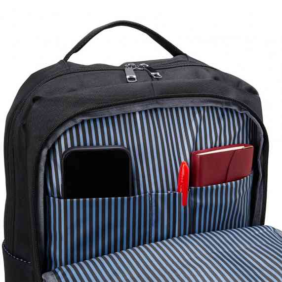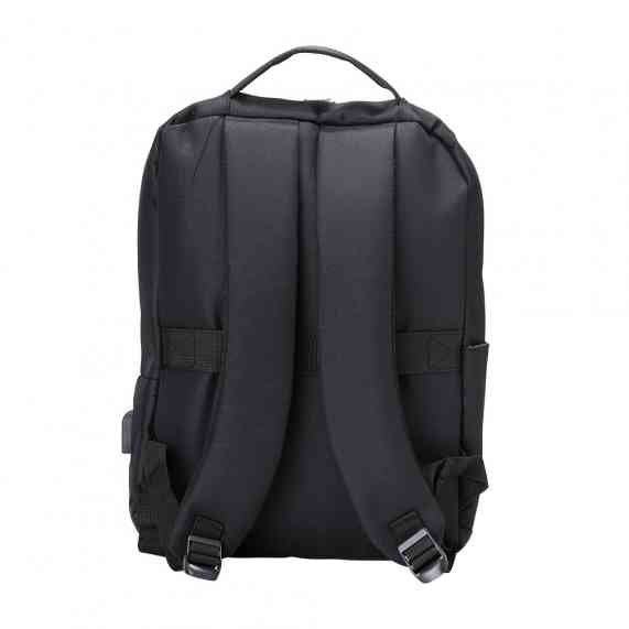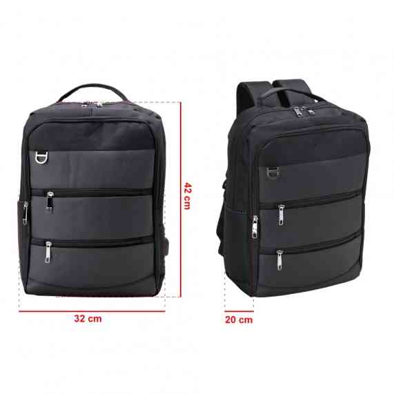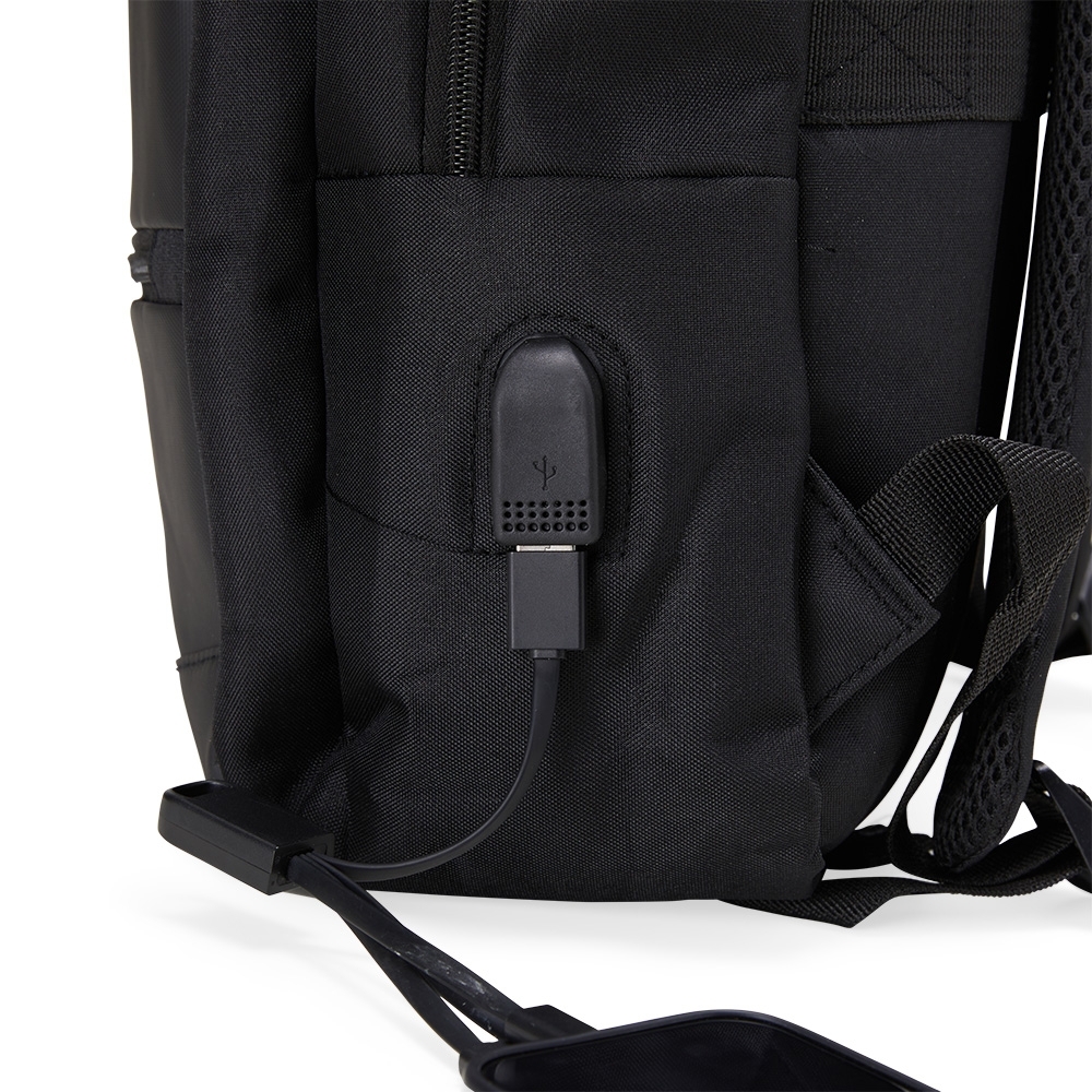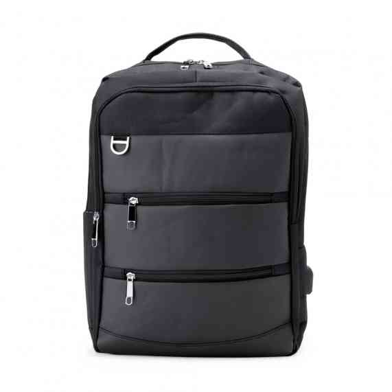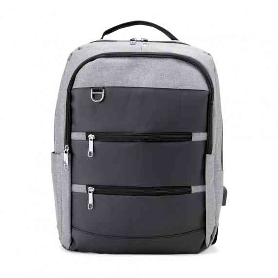 Mochila de nylon 26 Litros com detalhes em couro sintético e quatro compartimentos, sendo o principal com bolso para notebook 15,6. Com divisórias internas para acessórios, a mochila possui bolso lateral, suporte externo USB e alça para engate em malas de viagem.