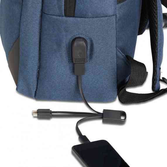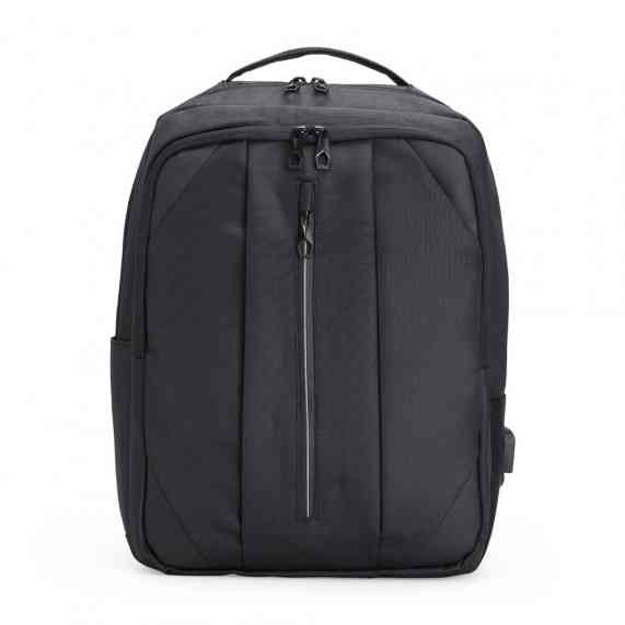 Mochila de nylon 27 litros com três compartimentos, sendo o principal com bolso para notebook 15.6 polegadas. Com divisórias internas para acessórios, bolso lateral, alça para engate em malas de viagem e suporte externo usb.
