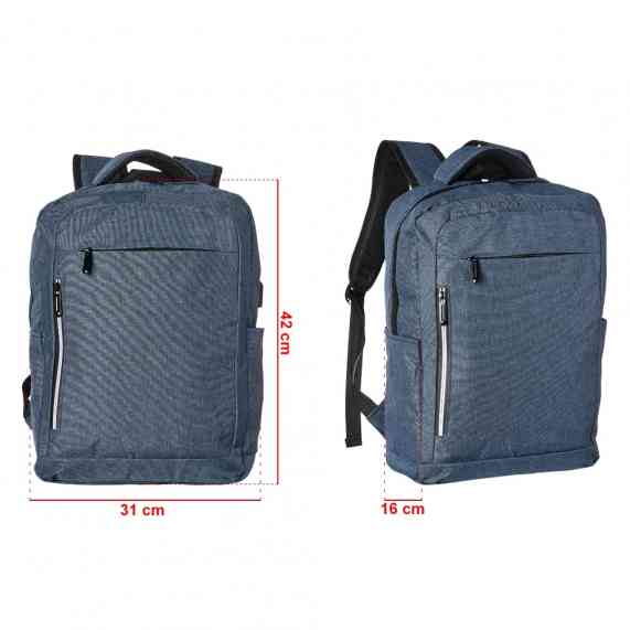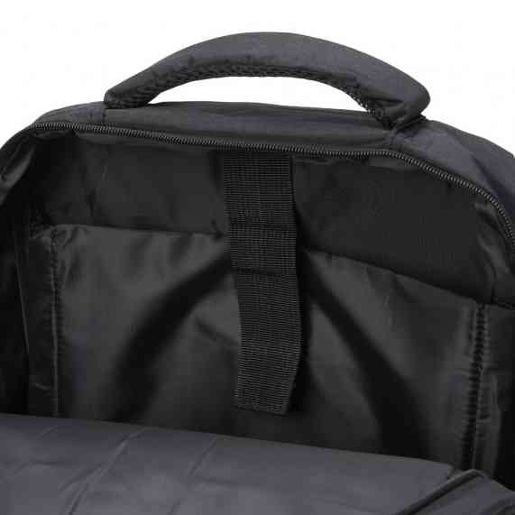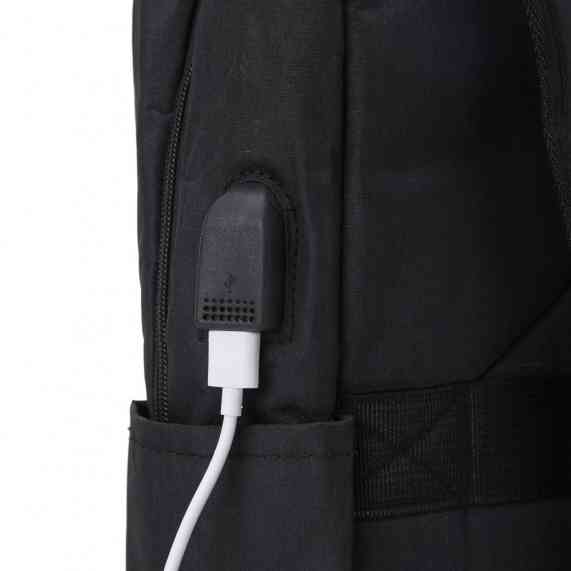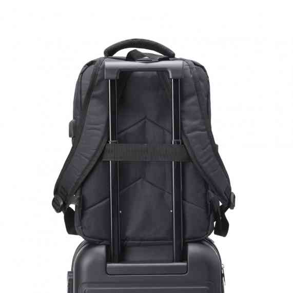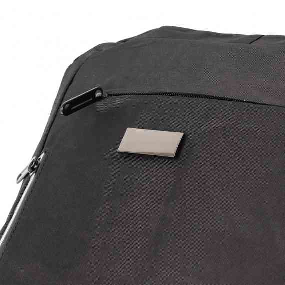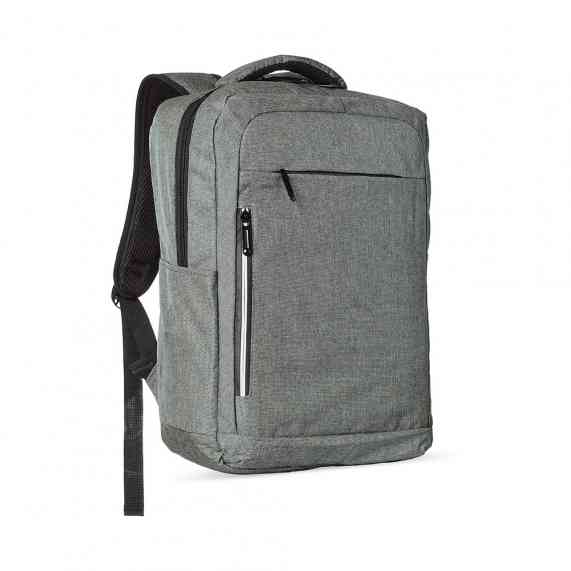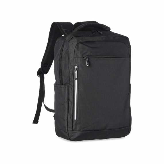 Mochila de nylon 20 litros com três compartimentos, sendo o principal com bolso para notebook 15,6. Com bolsos laterais e faixa frontal refletiva, a mochila possui adaptador USB externo, alça para encaixe em malas de viagem, duas alças de mãos e alças para as costas com revestimento espumado.