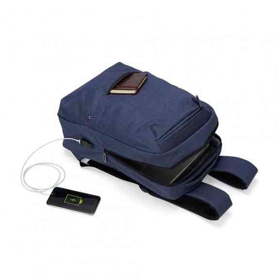 Mochila de nylon 21 litros com três compartimentos, sendo o principal com bolso para notebook 156. A mochila possui bolso lateral e suporte externo usb.