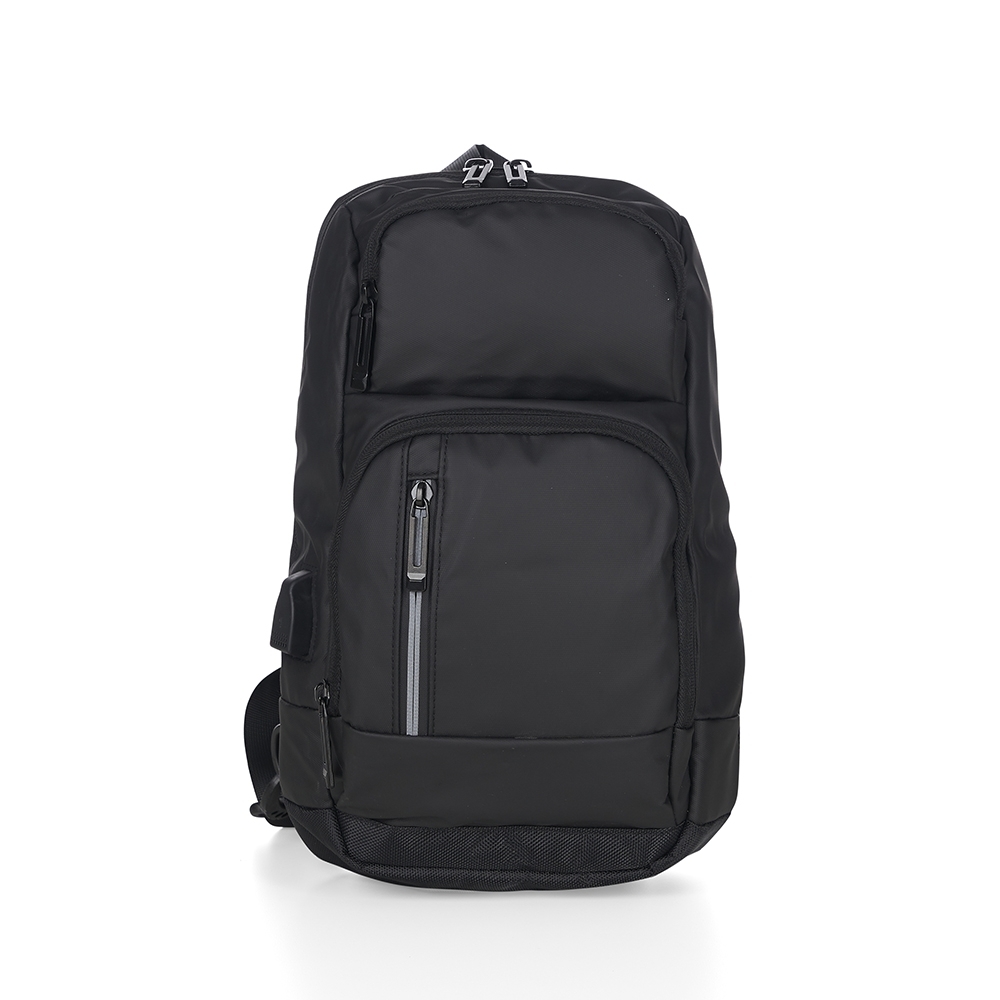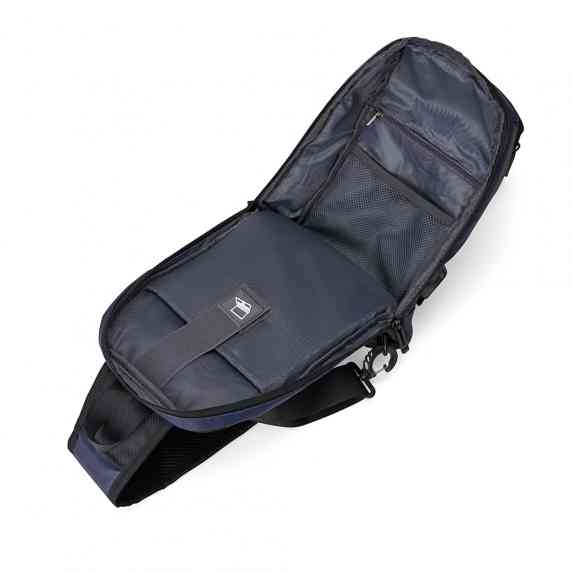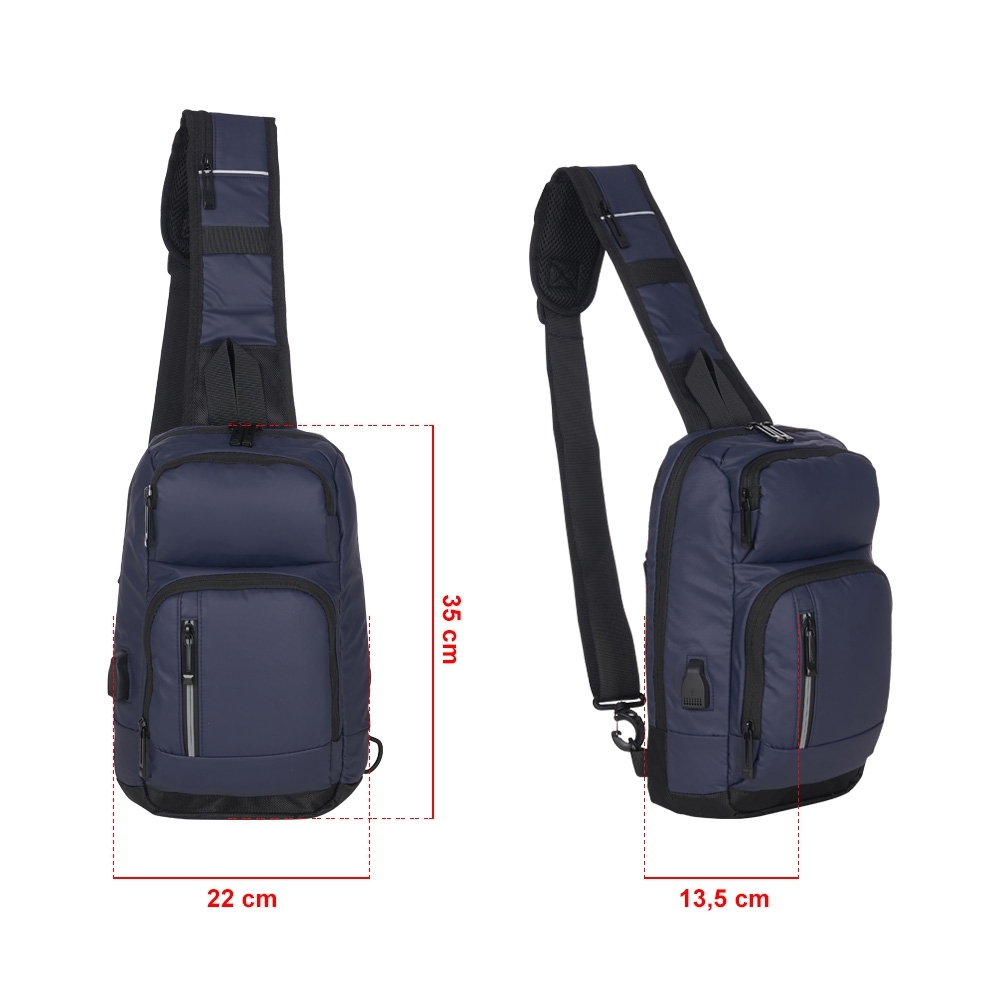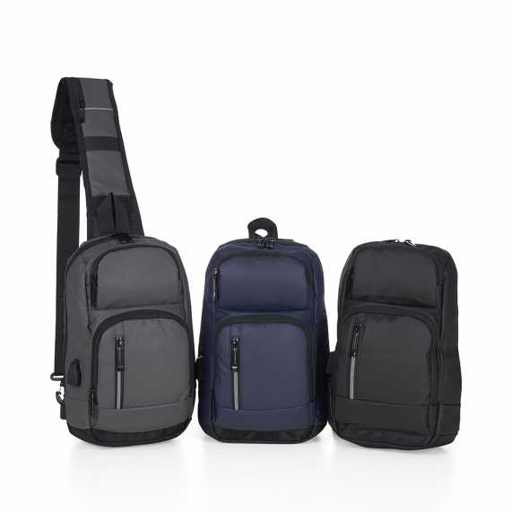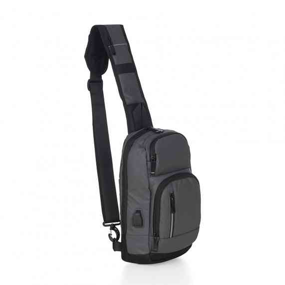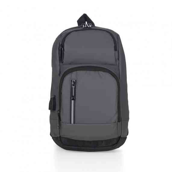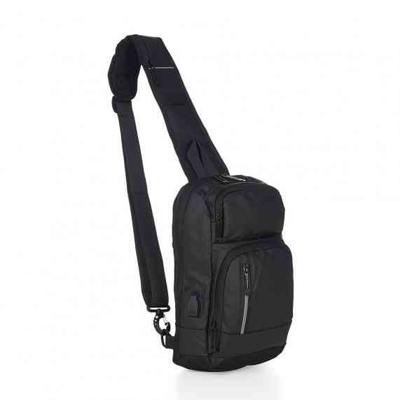 Mochila de ombro 10 litros em couro sintético resistente à água com seis compartimentos, sendo dois deles exclusivos para cartões e proteção contra furto. Contém suporte externo usb, bolso para tablet 9, bolsos internos, faixa refletiva e revestimento costado espumado.