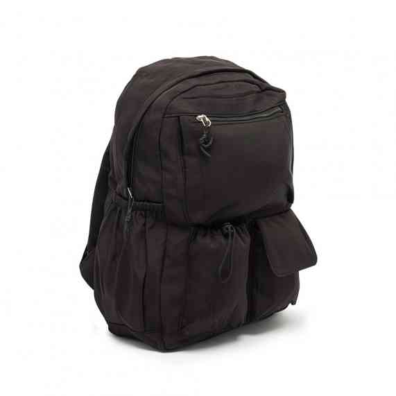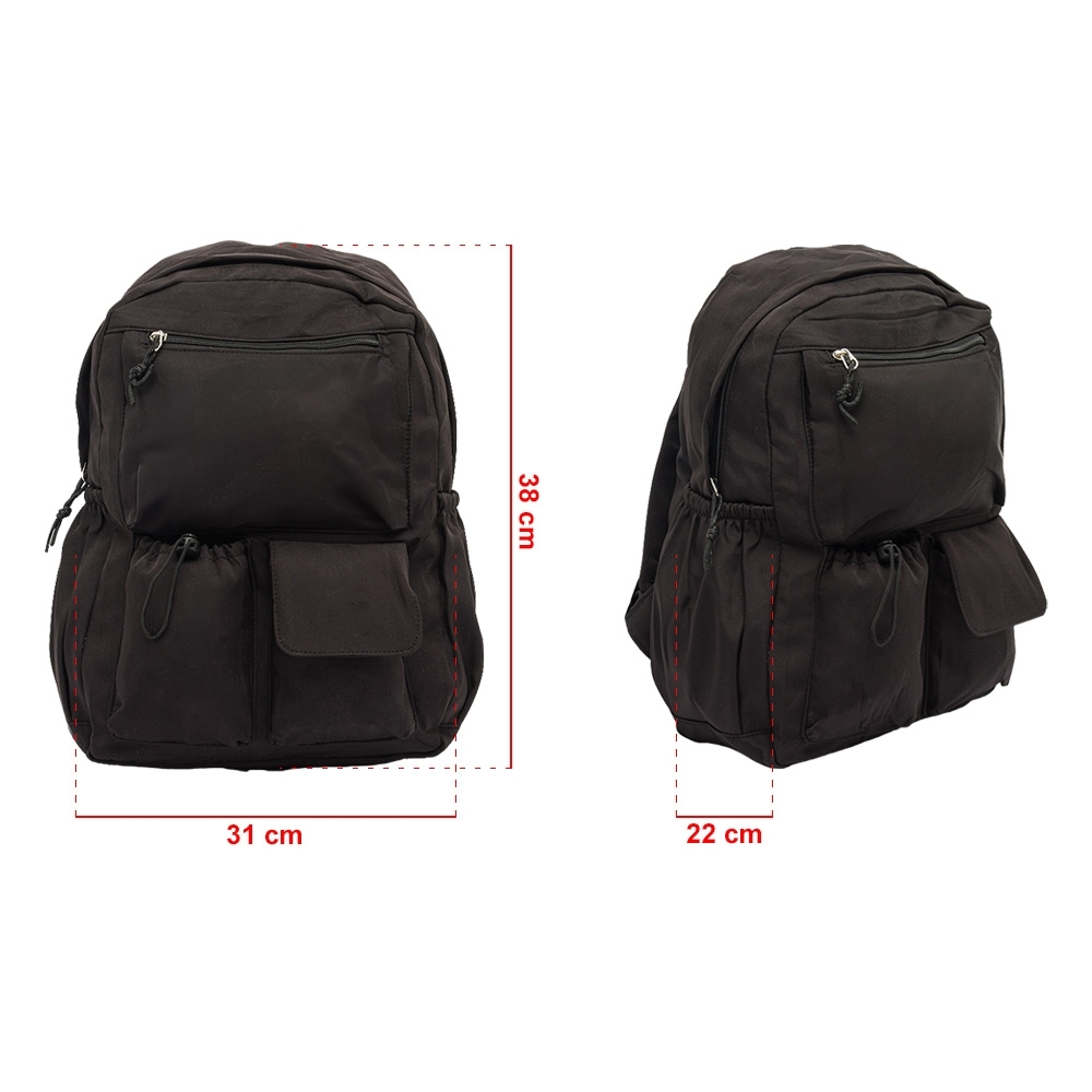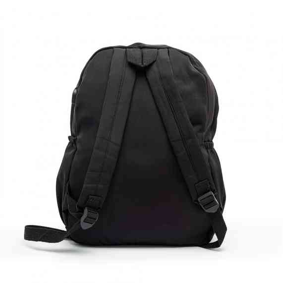 Mochila de poliéster de 25 litros com dois compartimentos, sendo o principal com um bolso raso para notebook de até 15,6 polegadas. A mochila possui um adaptador USB externo e quatro bolsos: dois laterais com elástico, um com velcro e um com cordão ajustável.