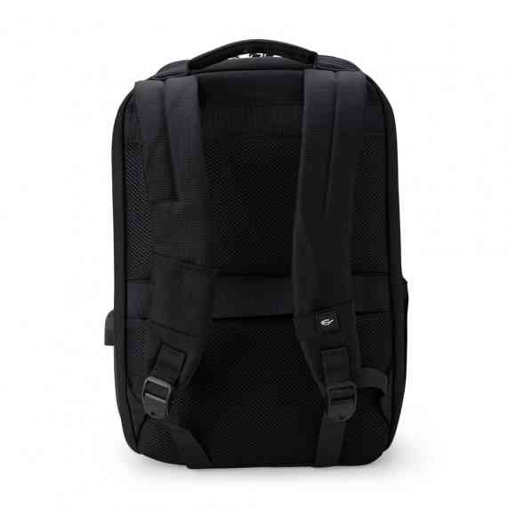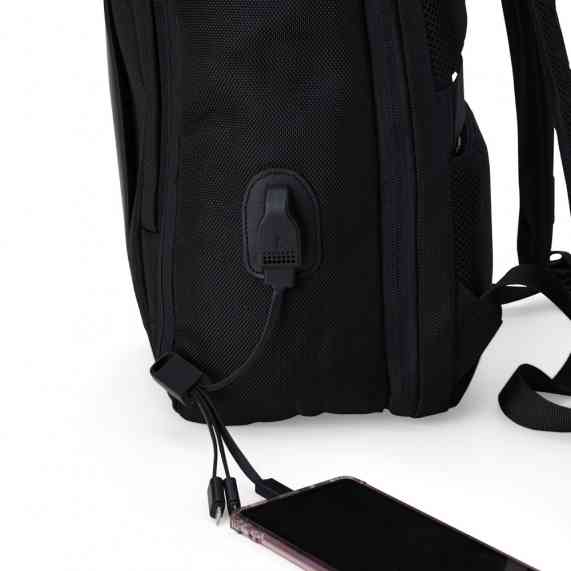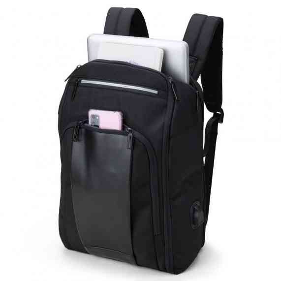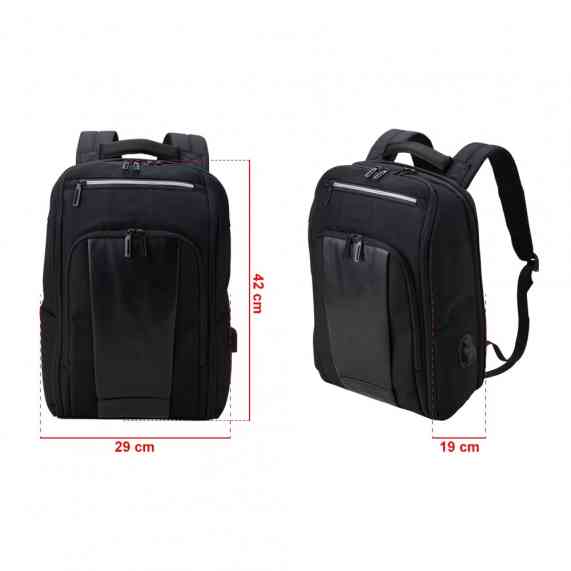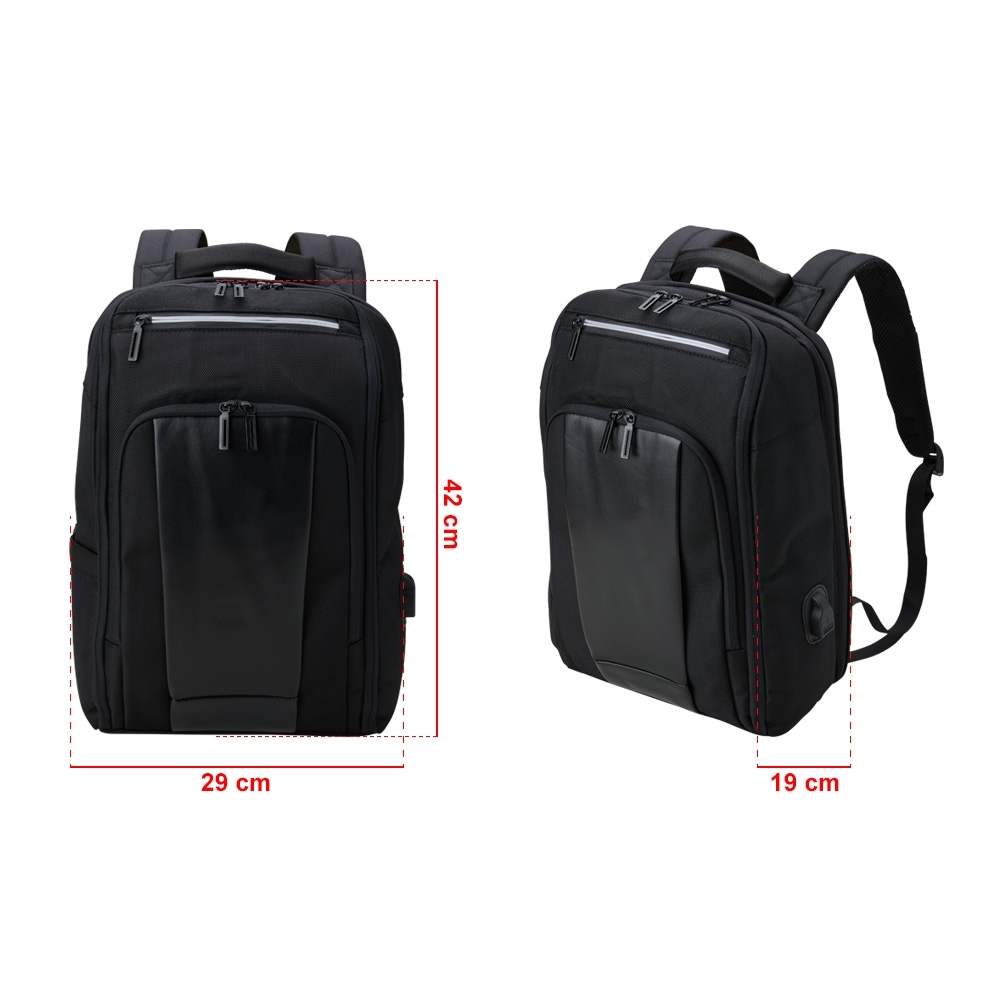 Mochila confeccionada em Nylon 23 litros com detalhes em couro sintético. Contém 5 compartimentos, sendo um bolso com faixa refletiva, divisórias internas para acessórios, bolso para tablet e notebook 15.6, bolso antifurto nas costas, bolso externo na lateral com elástico, suporte externo USB, alça para encaixe em malas de viagem, alças da mochila possuem bolsos integrados para suporte de óculos e cartões.