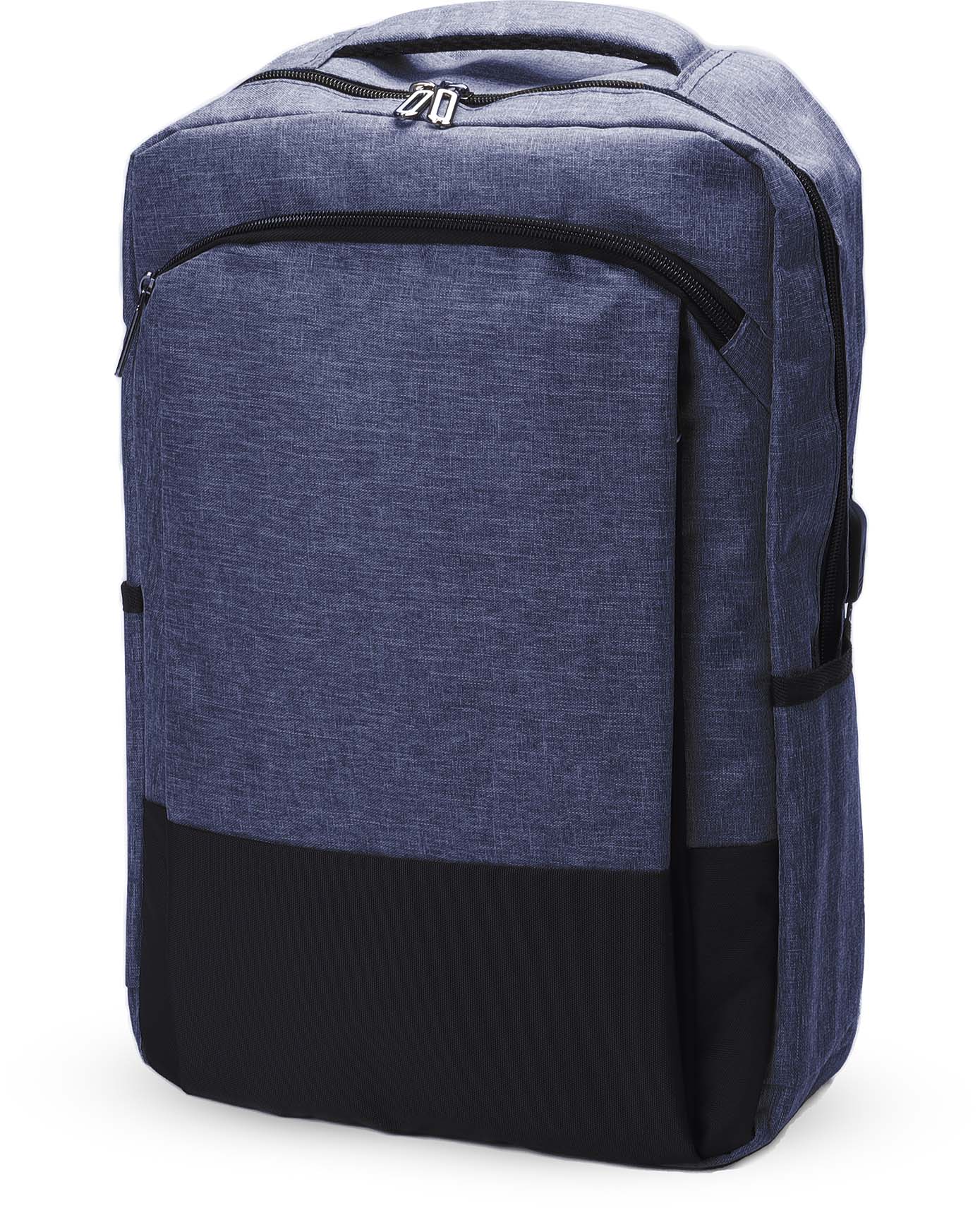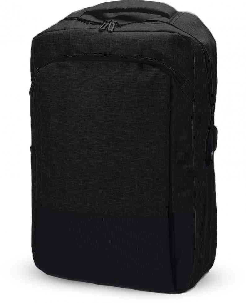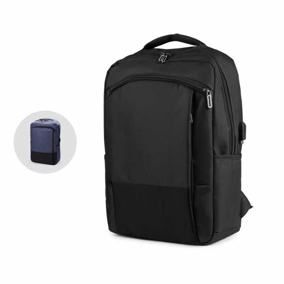 Parte externa: Bolso frontal com zíper, bolso pequeno na lateral direita. Conector USB. Alça de mão. Alça de ombro acolchoada.