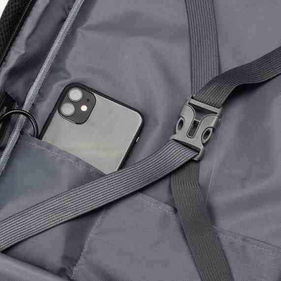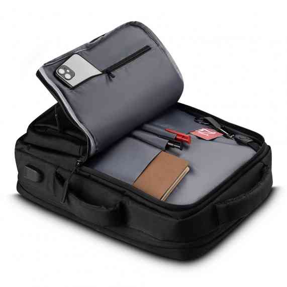 Mochila produzida em tecido de poliéster, alça de ombro e mão acolchoada,2 bolsos frontais e divisórias internas, aceita notebooks de até 15,6", porta USB na lateral da mochila, possui engate para mala de viagem.