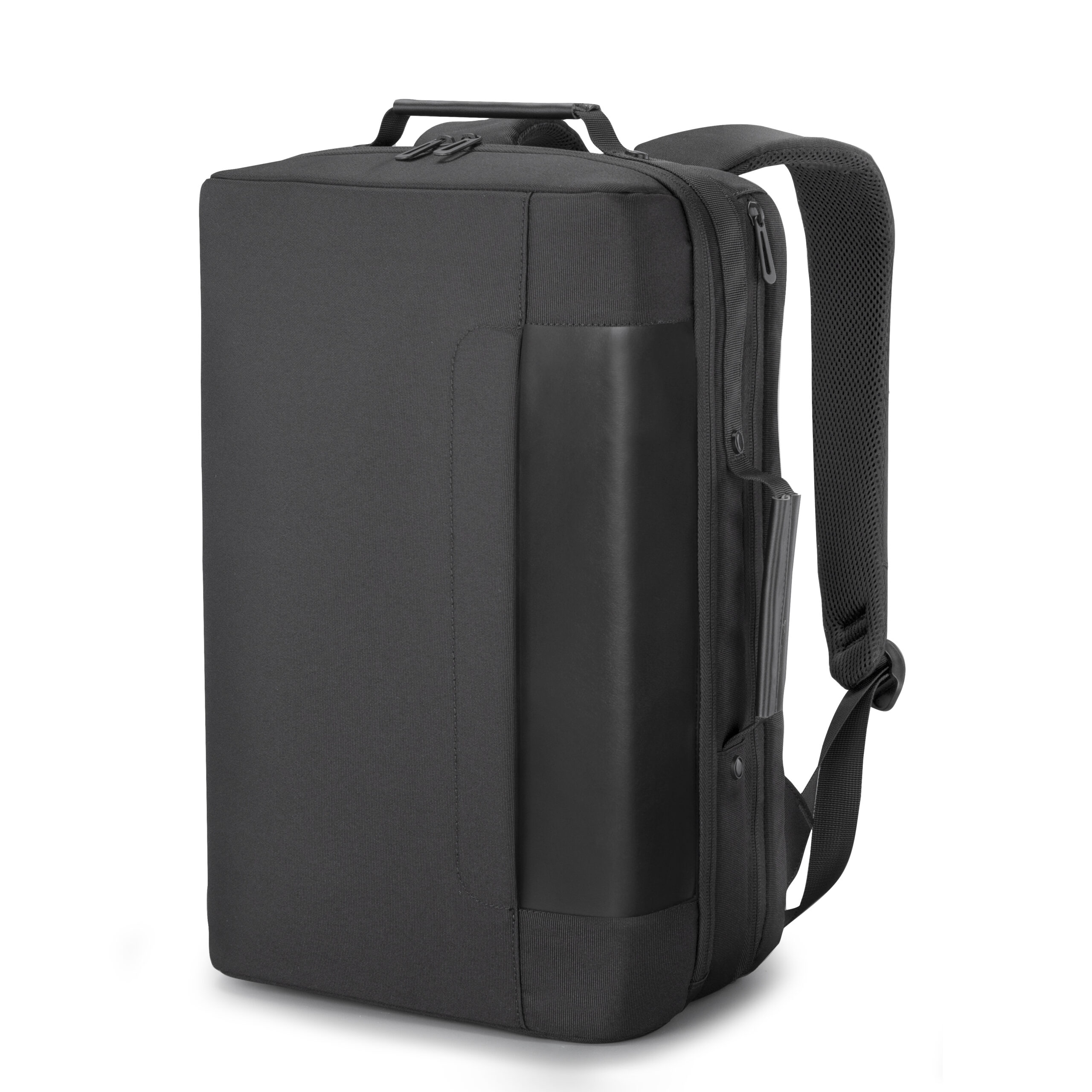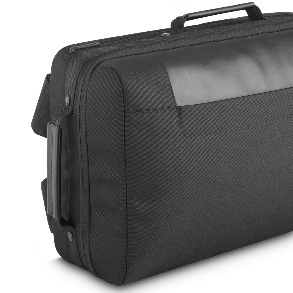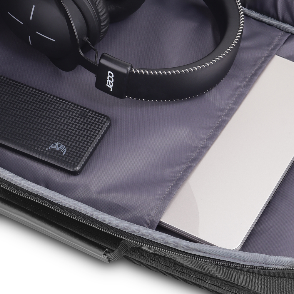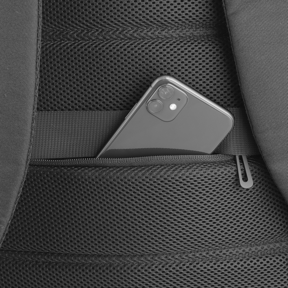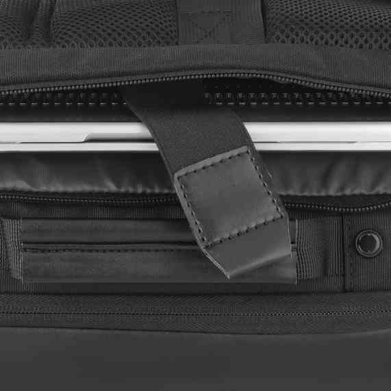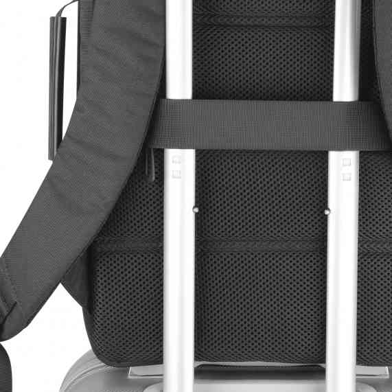 Mochila premium, produzida com poliéster acolchoado, alças de ombro acolchoadas, interior com divisórias, bolso frontal com zíper e na parte das costas uma divisória atrás do engate para mala de viagem, aceita notebook de até 15,6”.