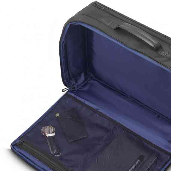 Mochila/Pasta premium, produzida em poliéster acolchoado, divisória com ampla abertura para acomodar vestuário e outros pertences, alças de ombro acolchoadas,alça na lateral para locomoção, interior com divisórias com zíper para acomodar pequenos objetos, engate para mala de viagem, aceita notebook de até 15,6”.