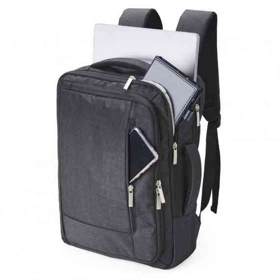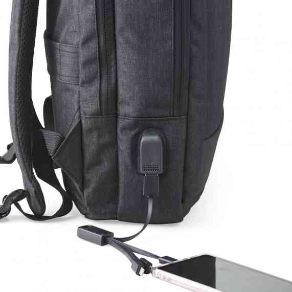 Mochila de poliéster 19 litros com 4 compartimentos, sendo o principal com bolso para notebook 15,6 e compartimento com bolso sanfonado, ideal para documentos. Com divisórias internas para acessórios, a mochila possui suporte externo USB, alça para engate em malas de viagem e duas alças de mãos, sendo uma delas para o transporte da mochila no formato pasta.