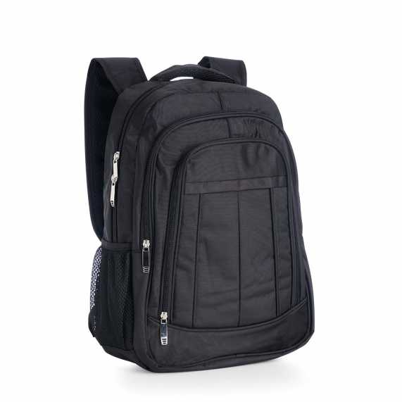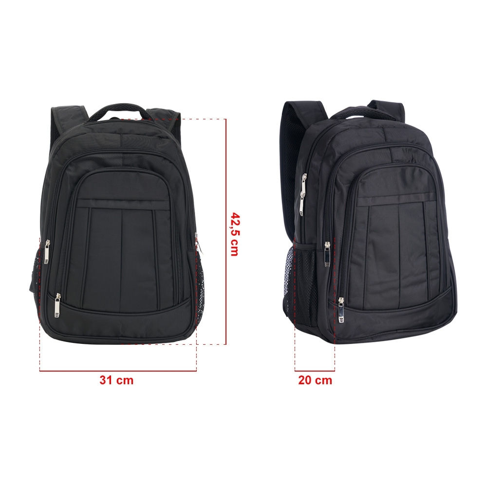 Mochila de poliéster 26 litros com três compartimentos, sendo o principal com bolso para notebook 156. A mochila possui bolsos laterais em malha, duas alças de mãos e área costada com revestimento espumado.