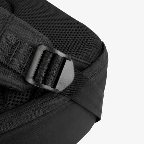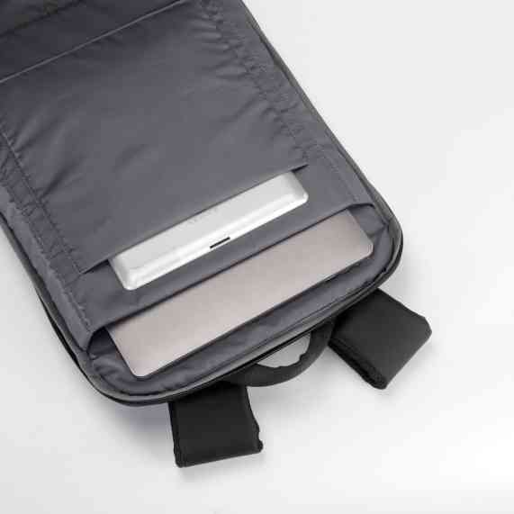 Mochila Premium, adequada para viagens de negócios, feito de tecido de poliéster, alças de ombro acolchoadas, e bolso frontal. Aceita notebook de até 15,6”, porta USB na lateral, engate para mala de viagem, com dois bolsos nas laterais.
