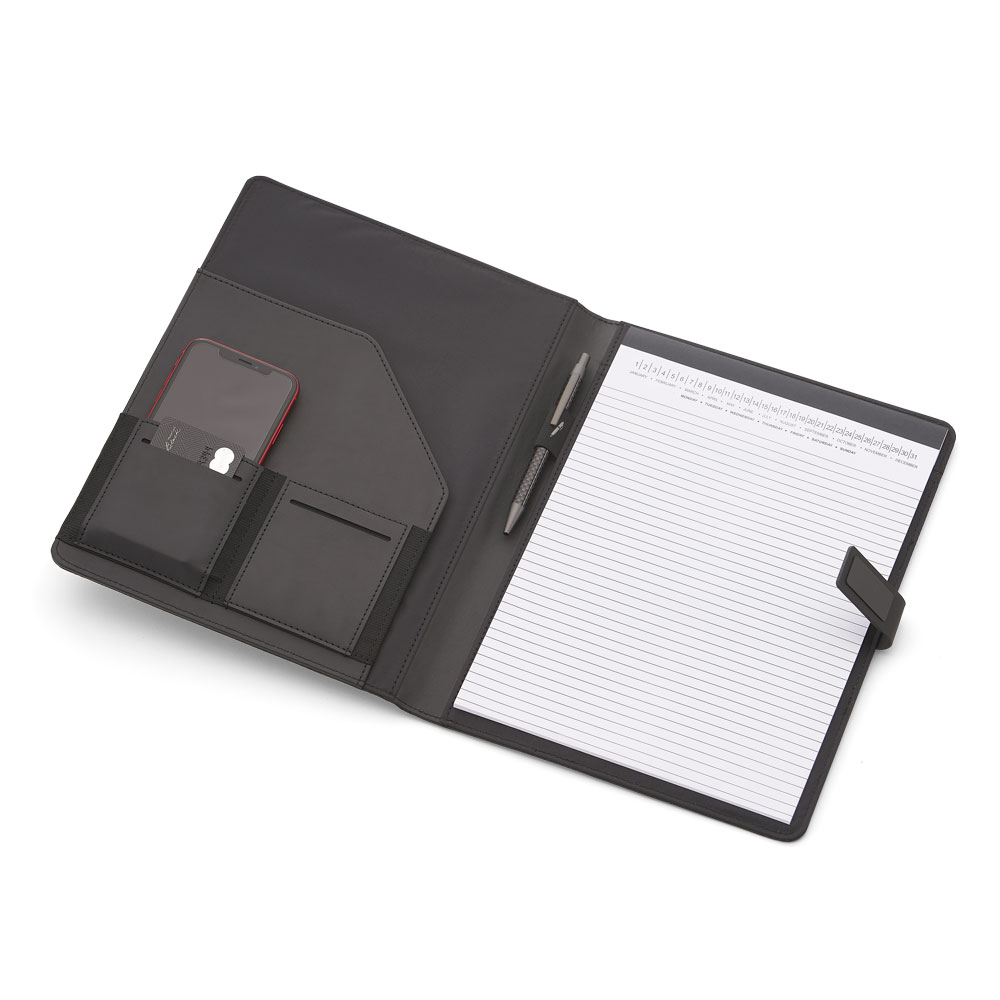 Pasta Executiva Almofadada com caderno de 20 folhas A4, Bolso na capa 8x12cm, Bolso interno para Cartões, Telefone e Documentos, Fechadura Magnética.