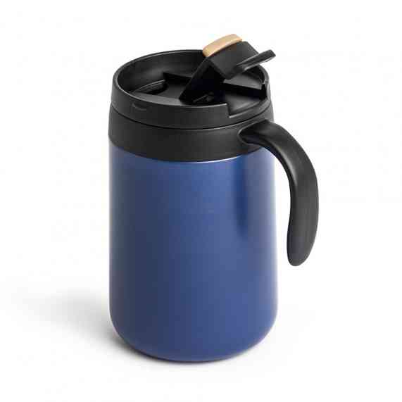Caneca térmica feita em inox 304 com parede dupla, capacidade de 500ml. Contém tampa com acesso para o bocal, alça plástica e base antiderrapante.