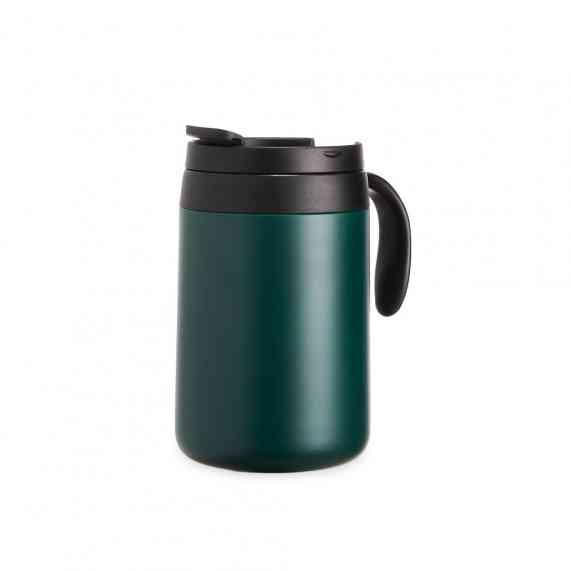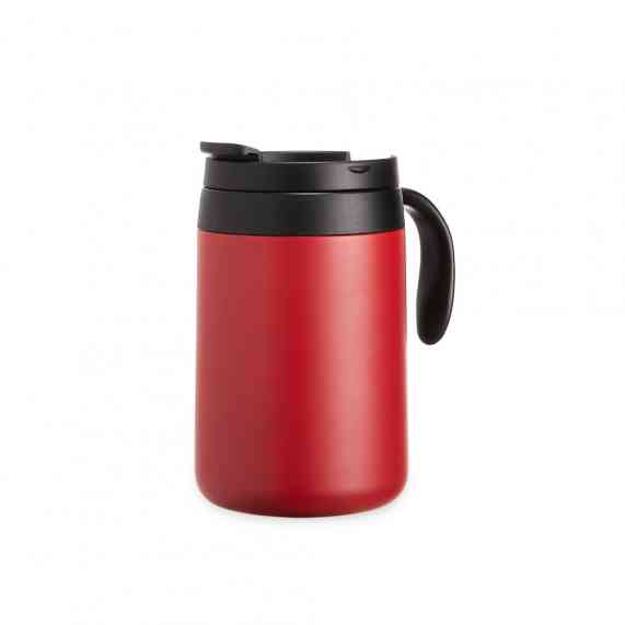 Caneca térmica feita em inox 304 com parede dupla, capacidade de 500ml. Contém tampa com acesso para o bocal, alça plástica e base antiderrapante.
