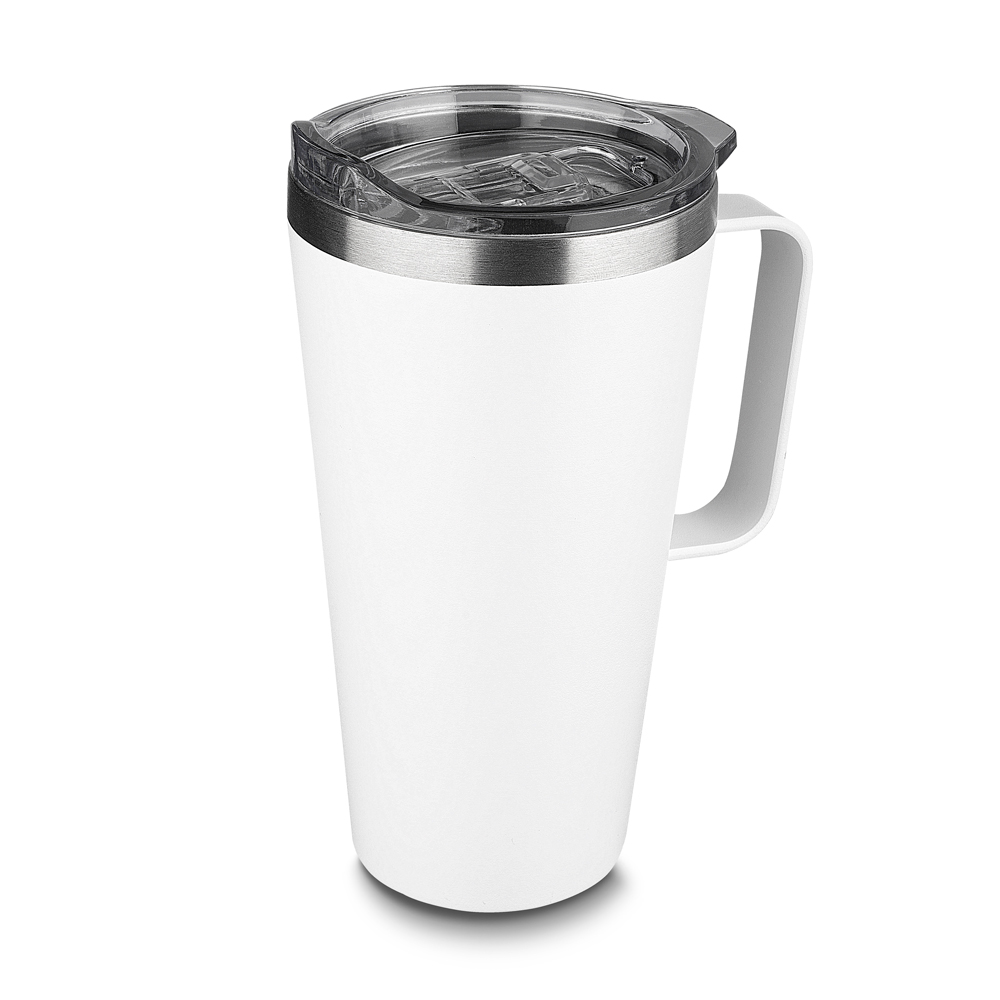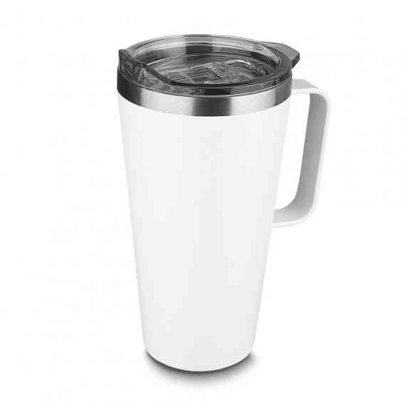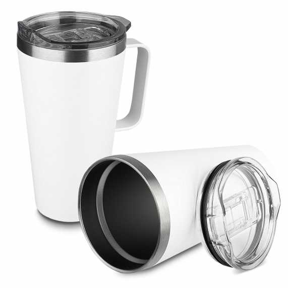 Caneca térmica em aço inox com parede dupla isolada à vácuo, tampa plástica e anel em silicone para vedação, alça lateral. Capacidade 530ml