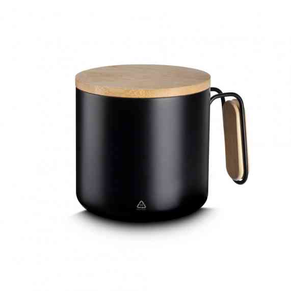 Caneca térmica em aço inox com parede dupla isolada à vácuo, tampa de bambu e anel em silicone para vedação, alça lateral com detalhe em bambu. Capacidade 380ml.