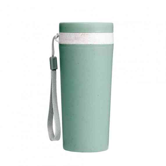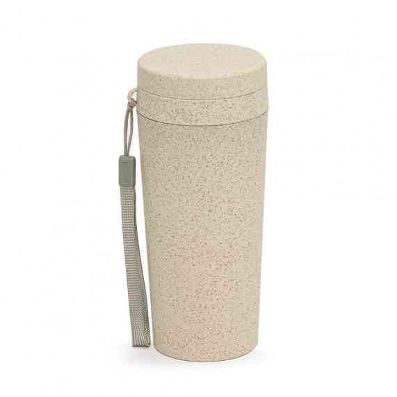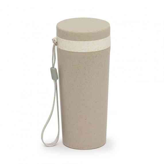 Copo fibra de bambu 350ml com parede dupla e alça. Copo produzido em Polipropileno livre de BPA, possui uma tampa de vedação rosqueável e alça de nylon (removível) para transporte. Conserva a temperatura interna durante um período de 1 à 2 horas, mas não dispõe de isolamento térmico. O copo pode ser levado a lava-louças, geladeiras e micro-ondas.