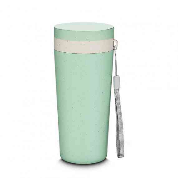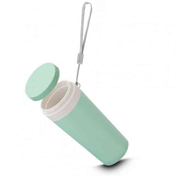 Copo plástico com parede dupla, produzido com fibra de trigo e plástico, com capacidade de 300ml, alça para transporte e tampa rosqueável.