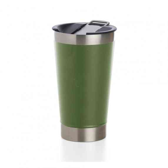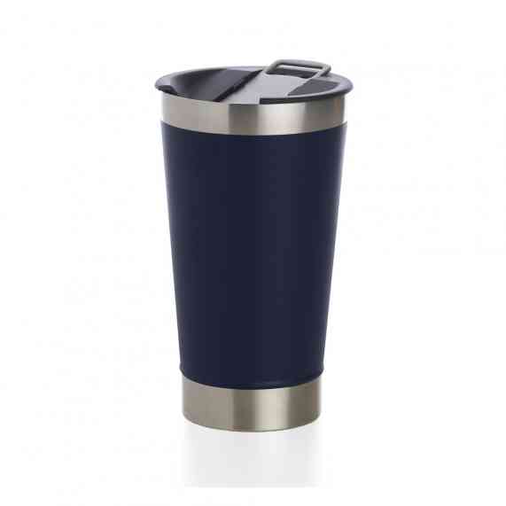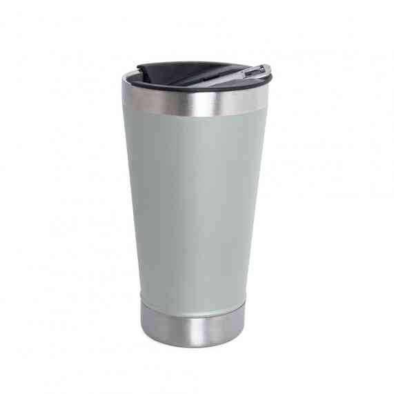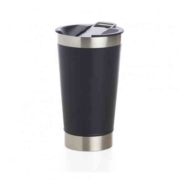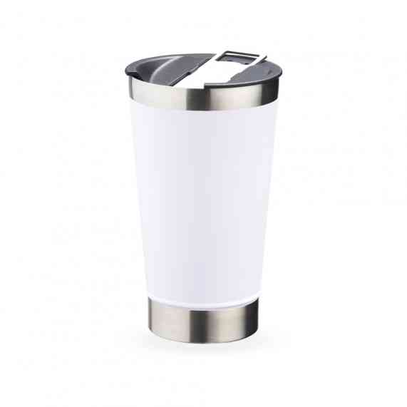 Copo térmico de inox com acabamento liso e capacidade 500ml, material livre de BPA. Contém tampa com abridor.