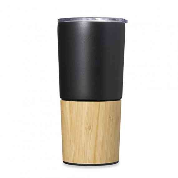 Copo térmico de inox 600ml com parede dupla e detalhe de bambu. Tampa com acesso ao bocal e trava de segurança.