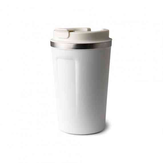 Copo térmico de inox 350ml com parede dupla, parte inferior com borracha antideslizante e tampa rosqueável com abertura de bocal.