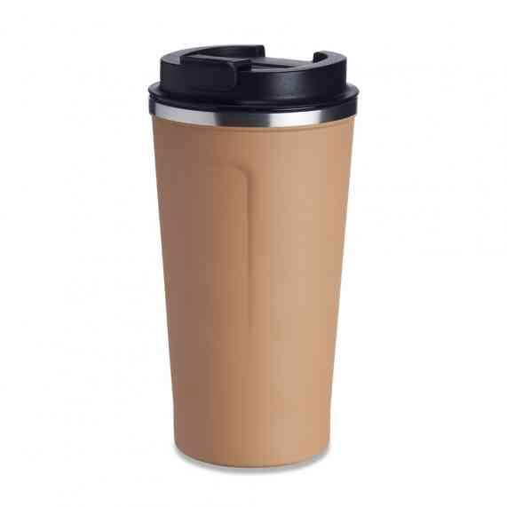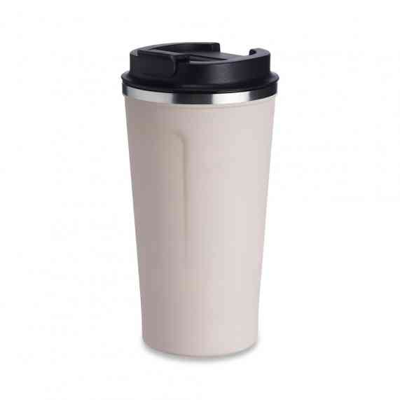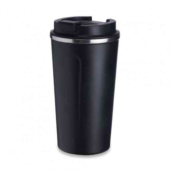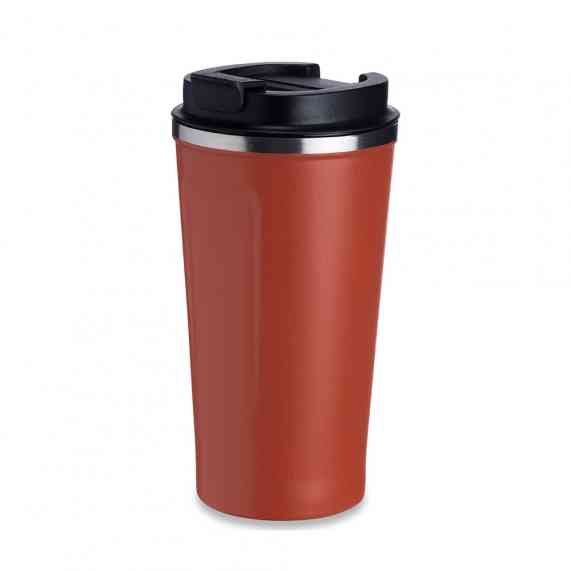 Copo térmico de inox 500ml com parede dupla, parte inferior com borracha antideslizante e tampa rosqueável com abertura de bocal.