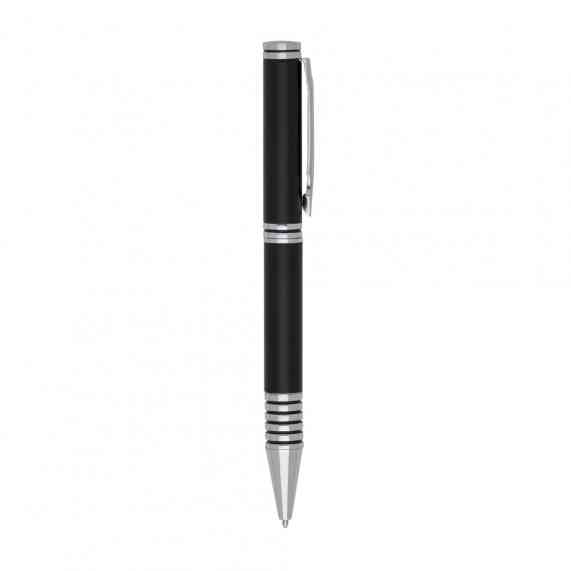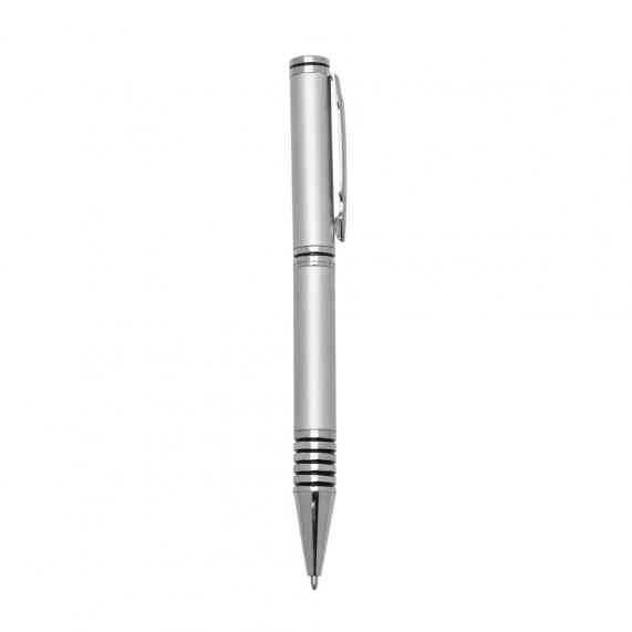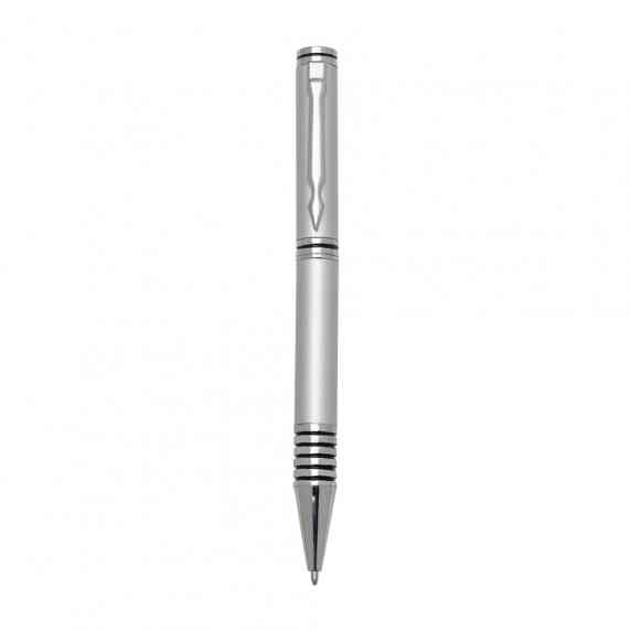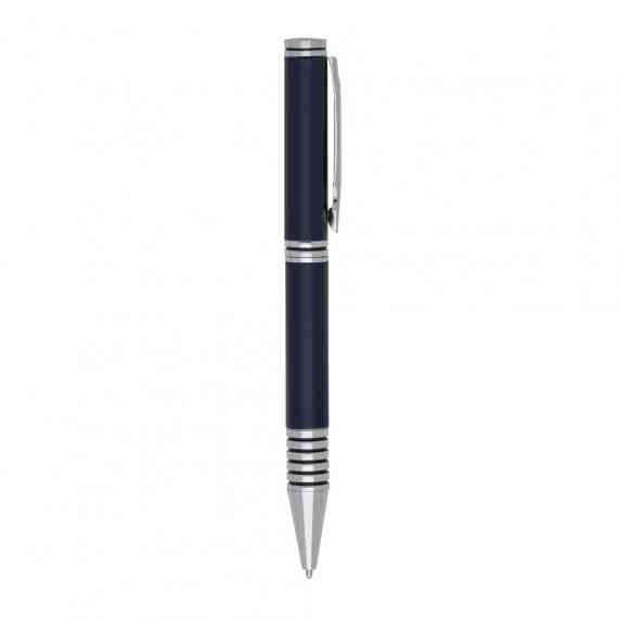 Caneta metálica com carga esferográfica azul e acionamento por rotação.