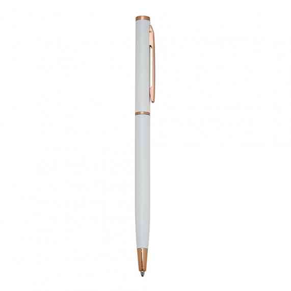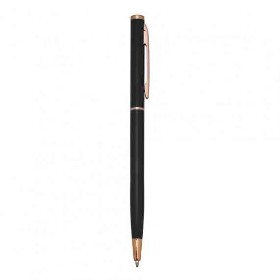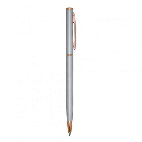 Caneta metálica com carga esferográfica azul e acionamento por rotação.