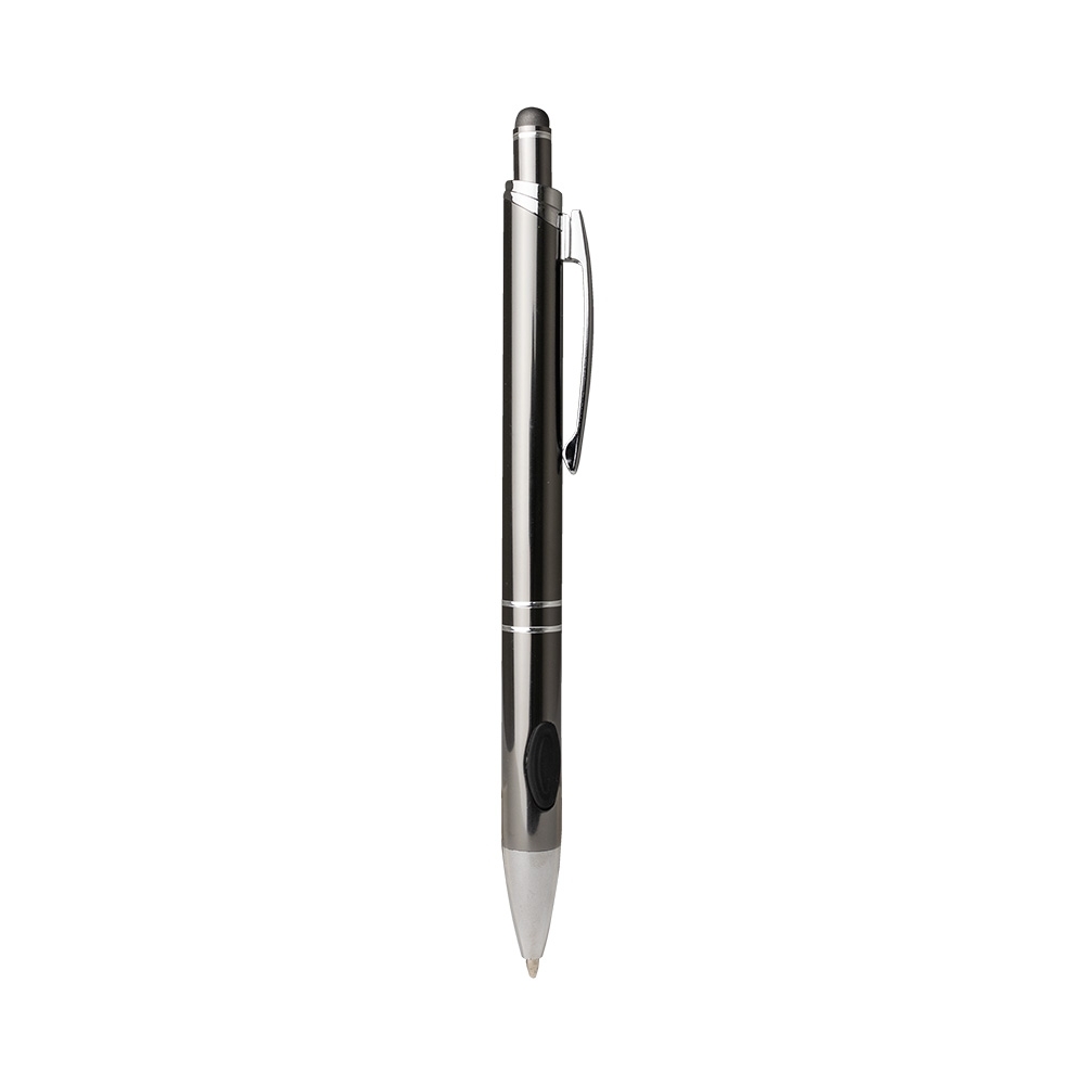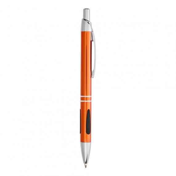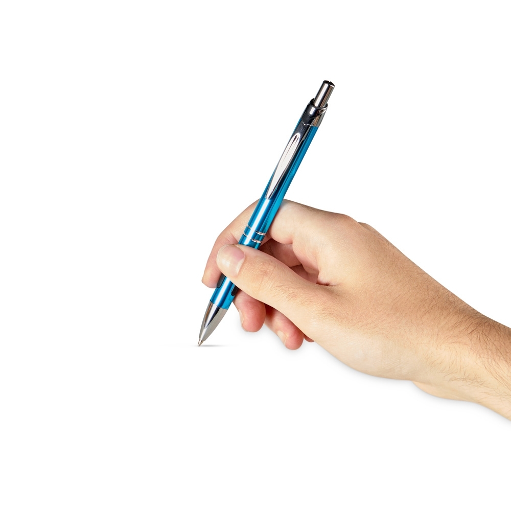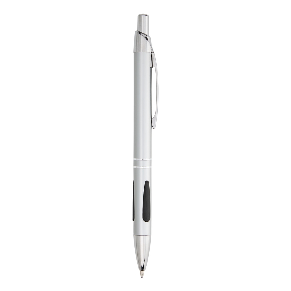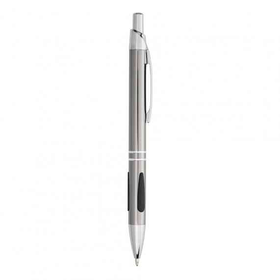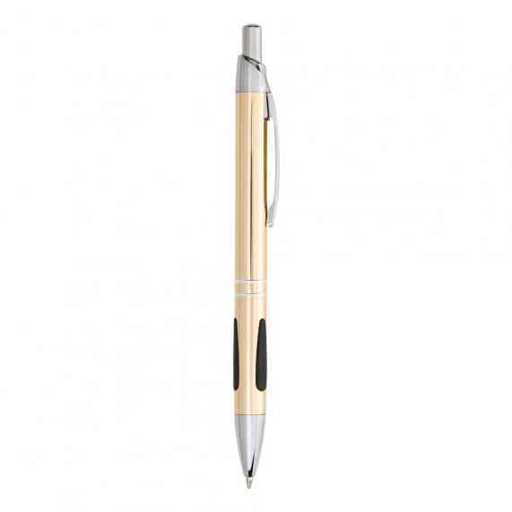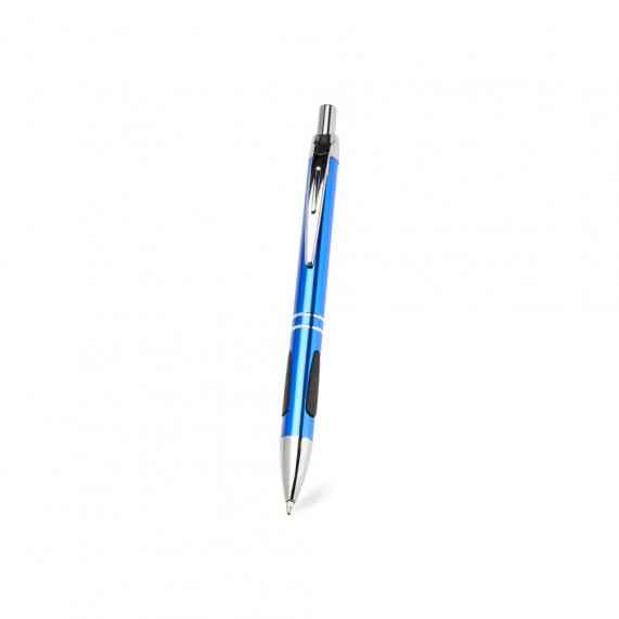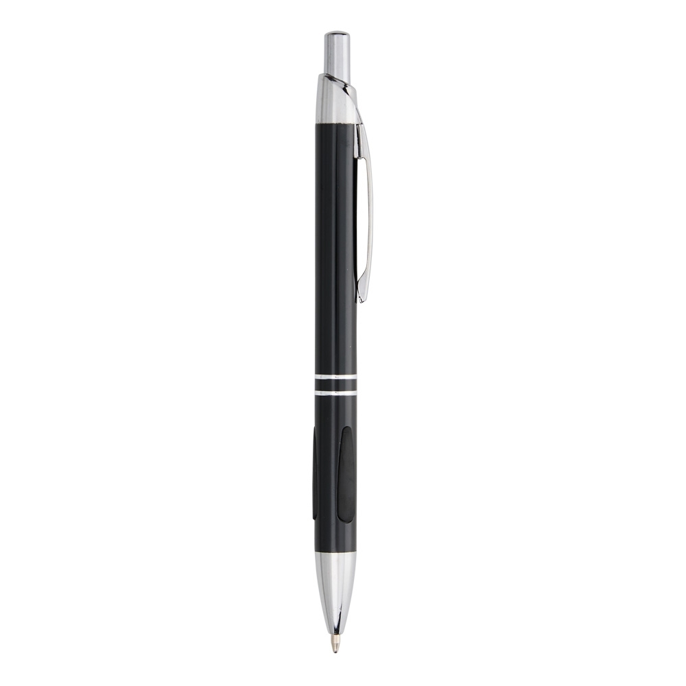 Caneta metálica com detalhe emborrachado, acionamento por clique e carga esferográfica azul 1.0mm.